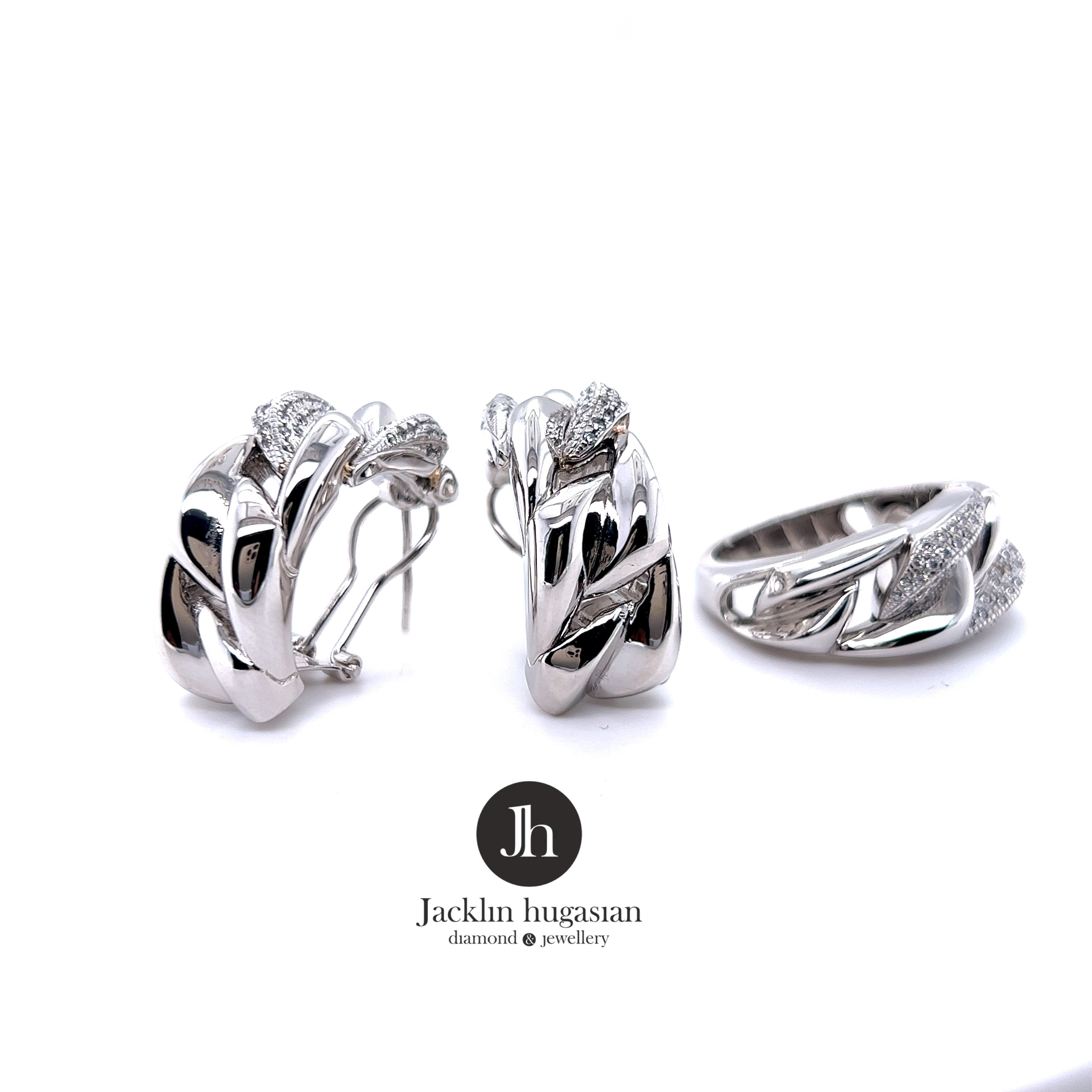 Комплект пръстен и обеци от “Jacklin hugasian” в бяло злато с циркони.