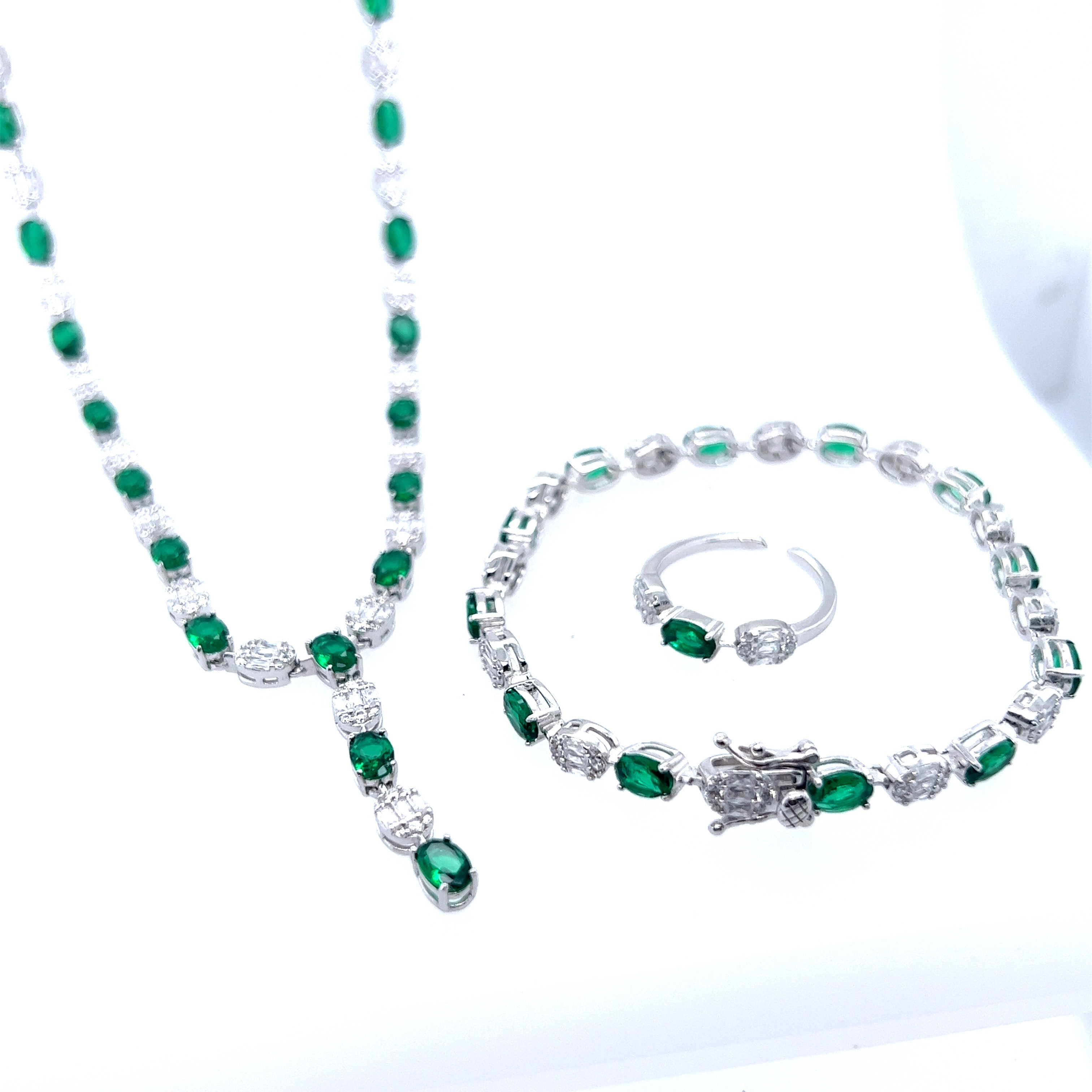 Комплект колие, обеци , пръстен и гривна от “Jacklin hugasian” в сребро с циркони и синтетичен изумруд.