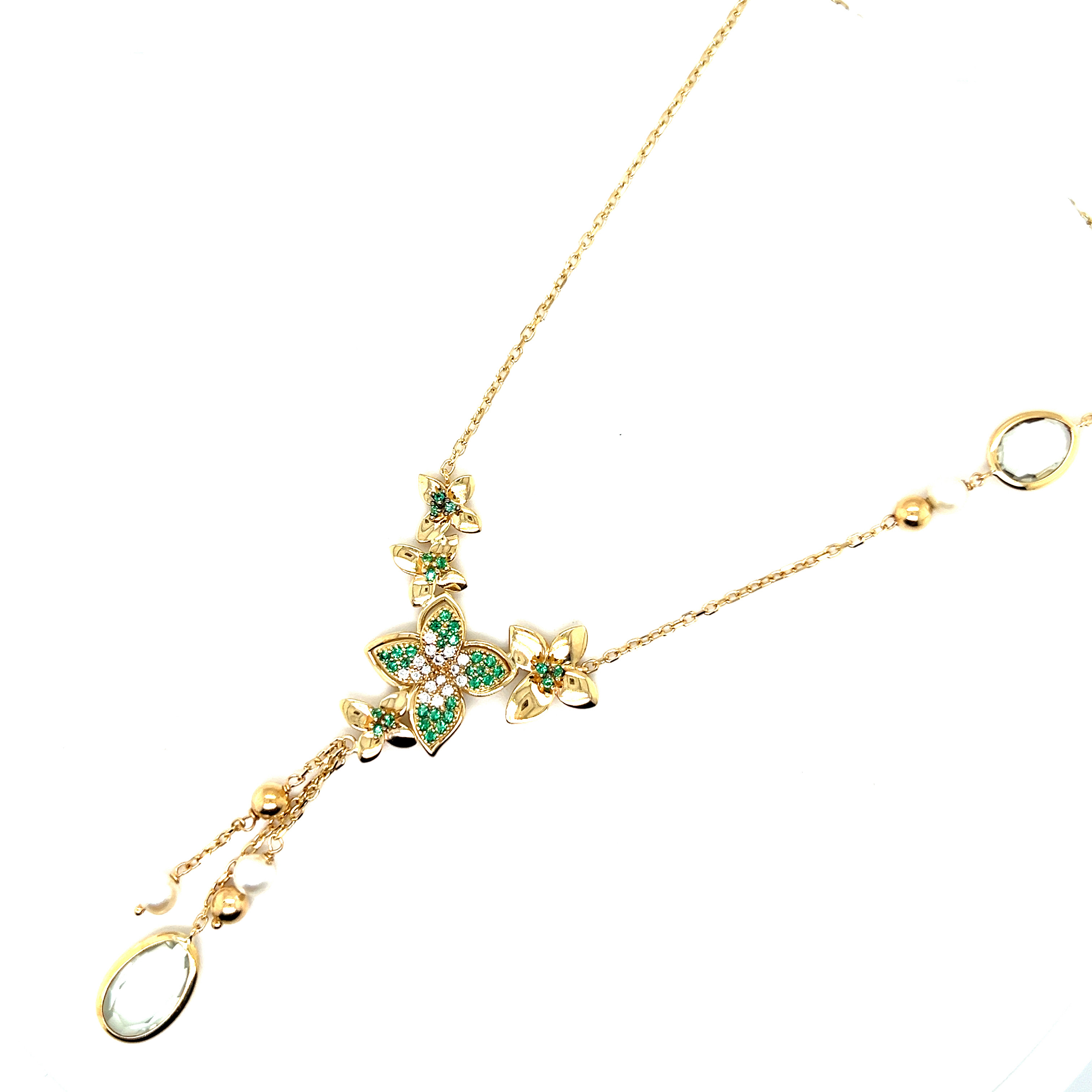Колие от “Jacklin hugasian” в жълто злато с перла,аквамарин,турмалин и циркони.