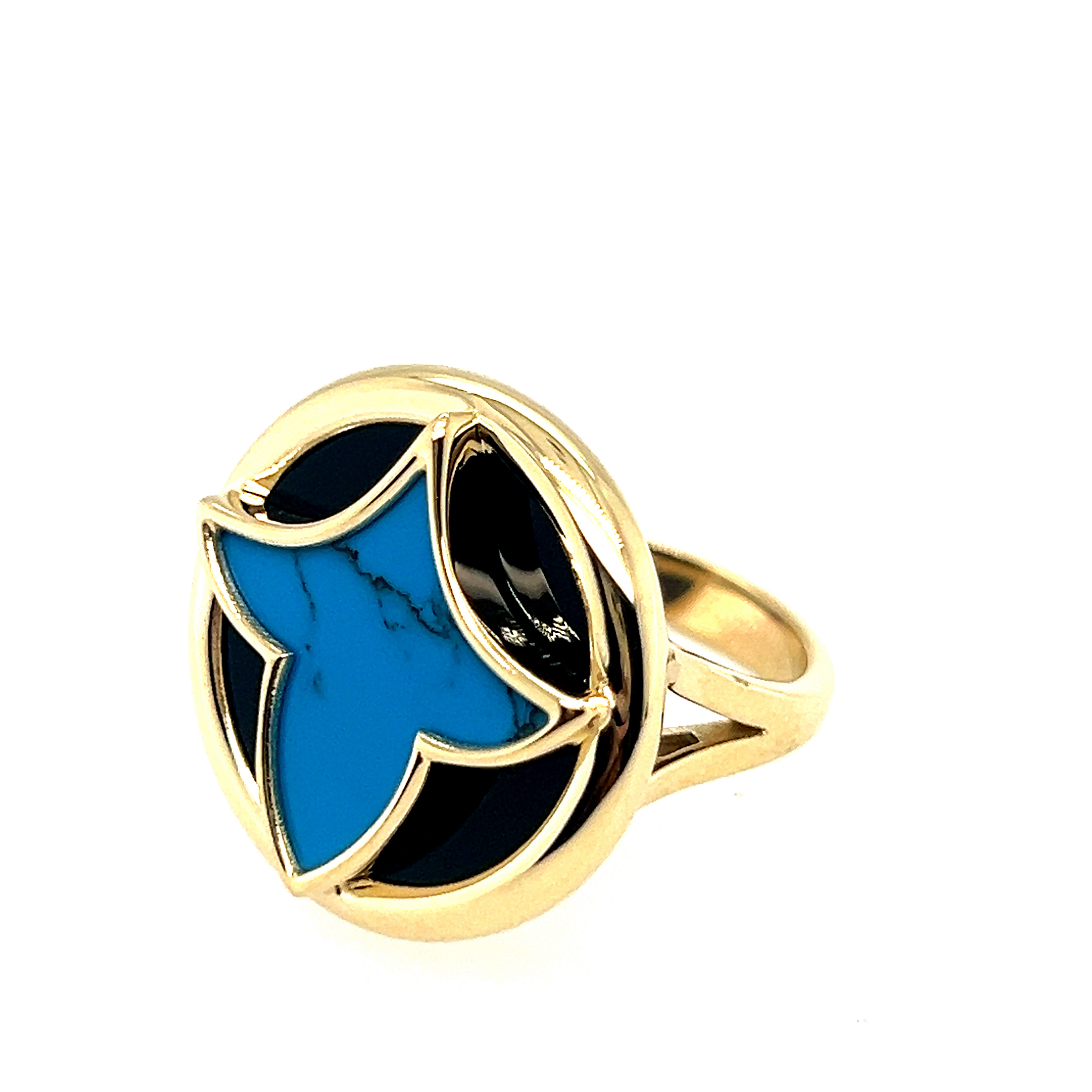 Пръстeн от “Jacklin hugasian” в жълто злато със седеф и малахит/ оникс и тюркоаз