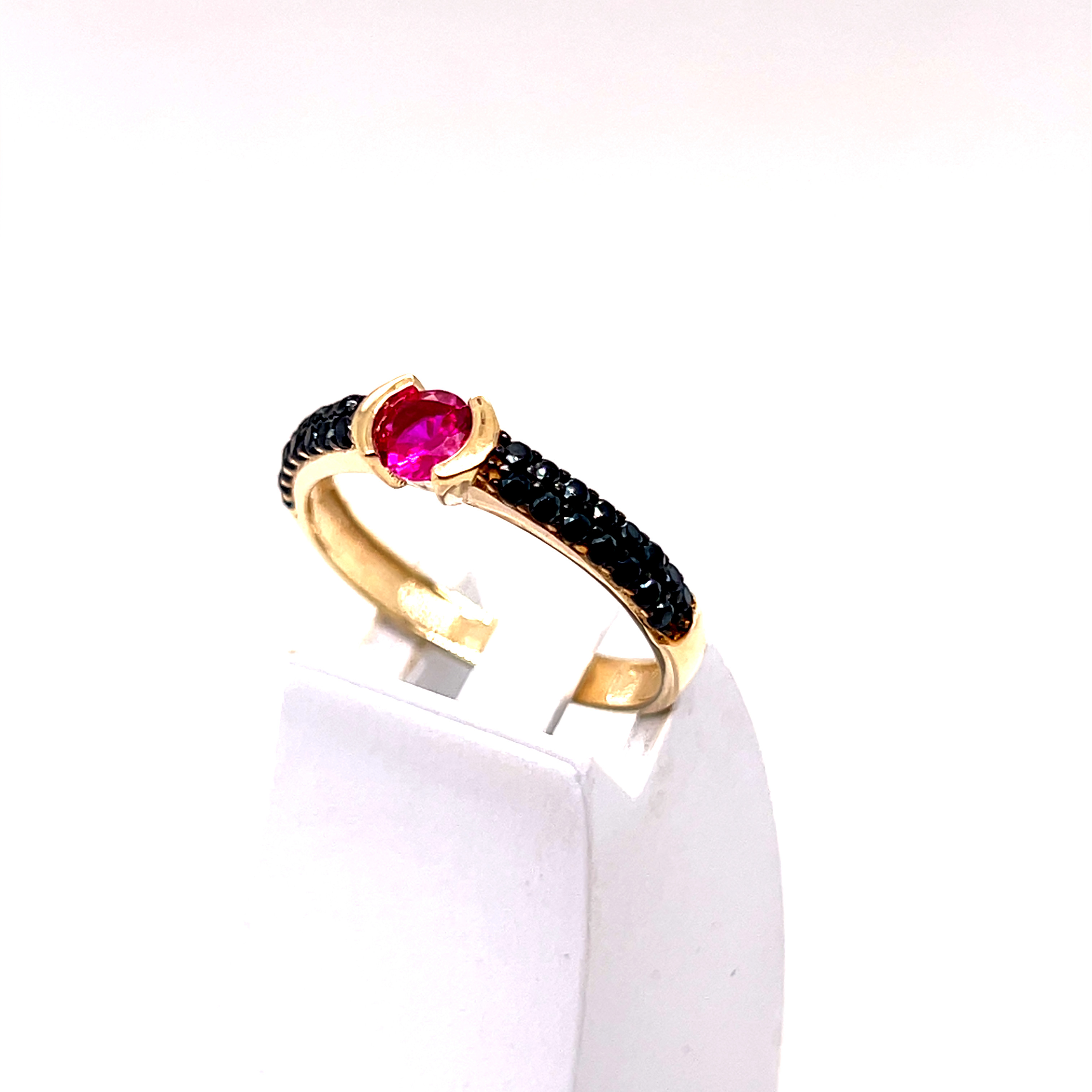 Комплект обеци и пръстен от “Jacklin hugasian” в жълто злато с оникс и рубин