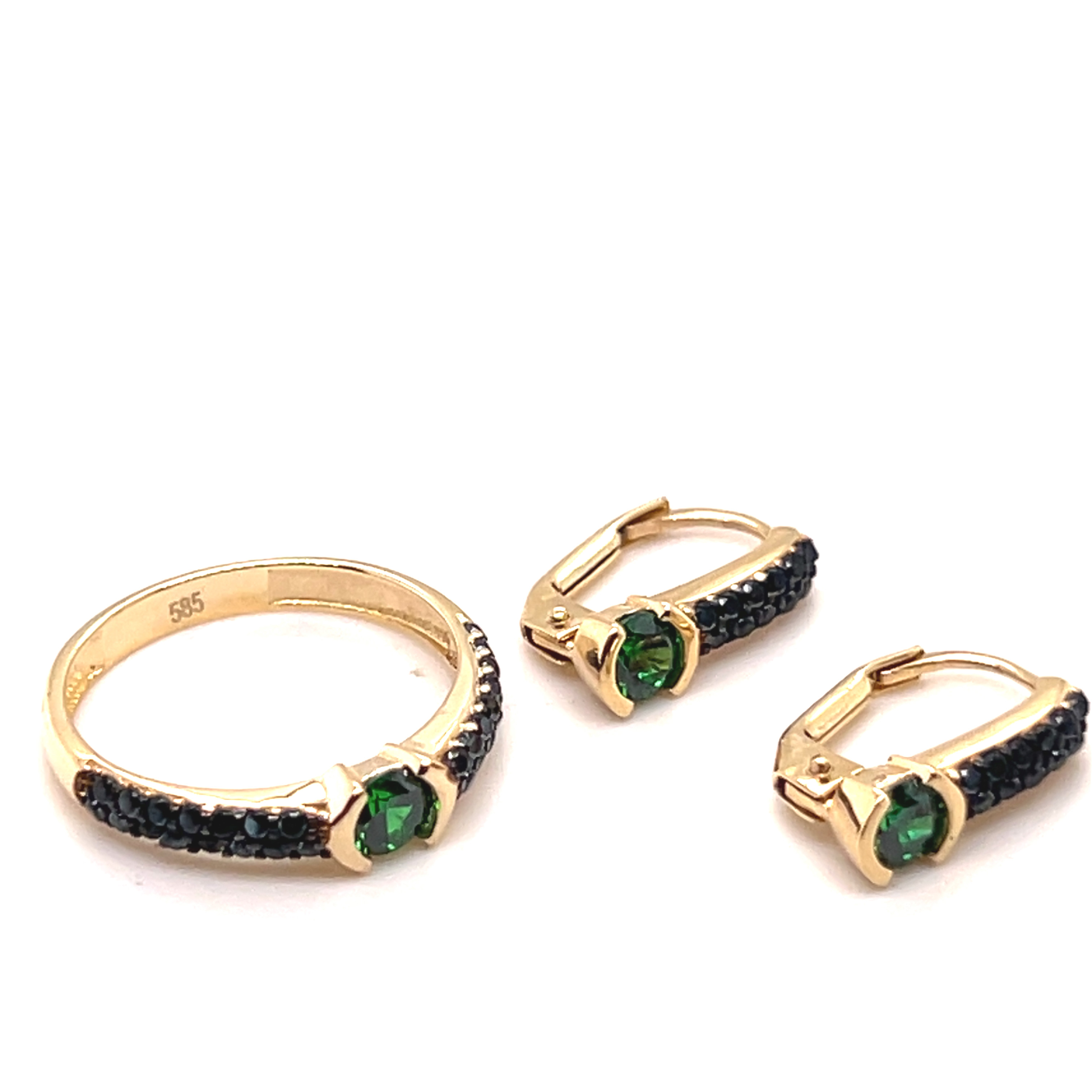 Комплект обеци и пръстен от “Jacklin hugasian” в жълто злато с оникс и синтетичен изумруд