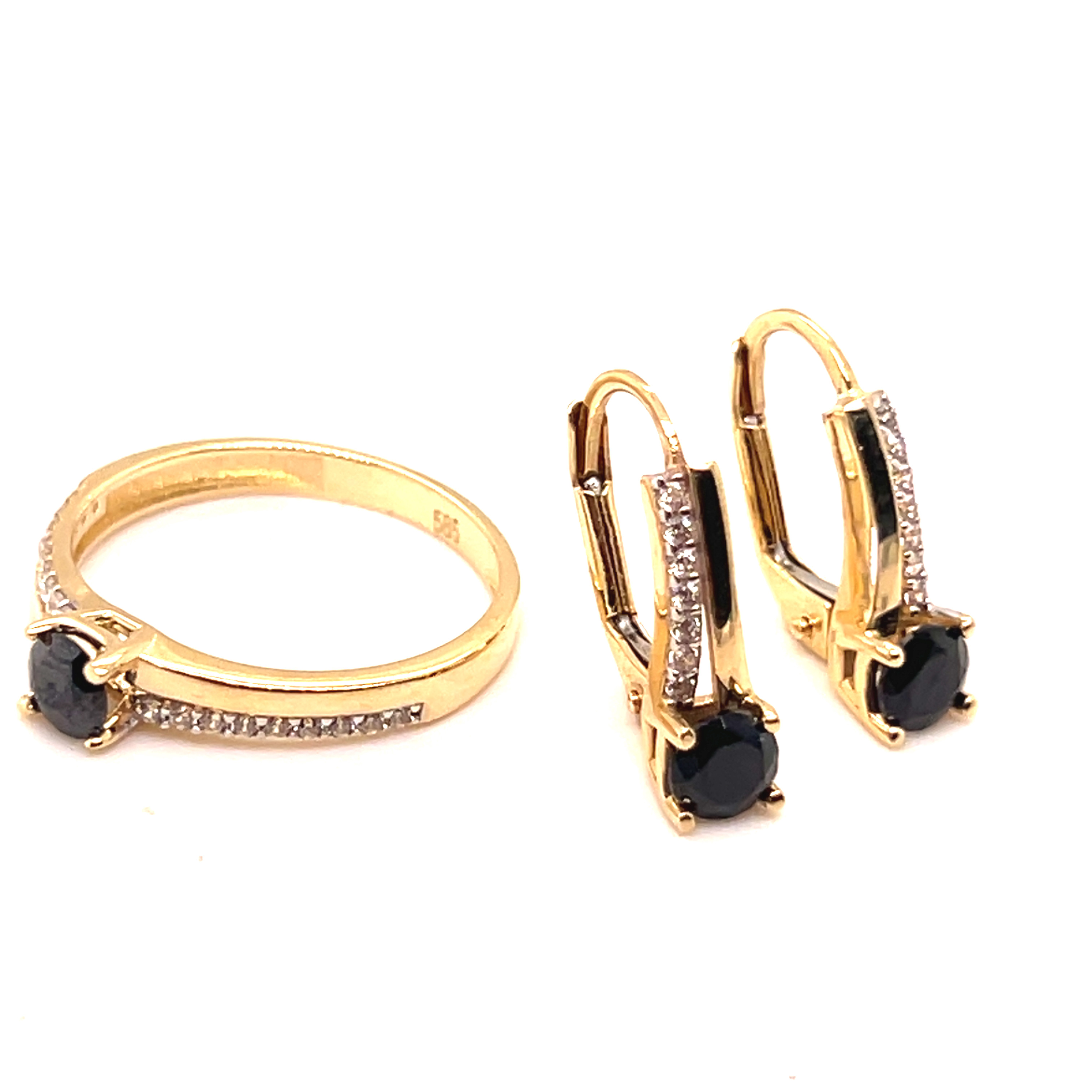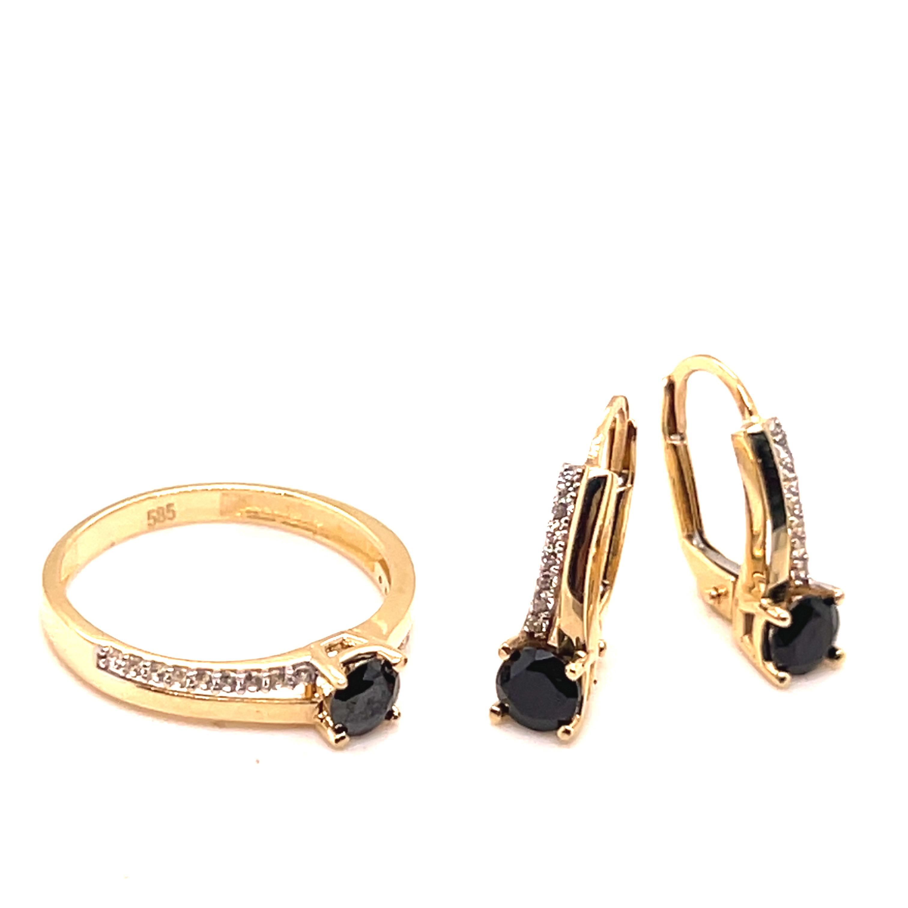 Комплект обеци и пръстен от “Jacklin hugasian” в жълто злато с оникс и циркони