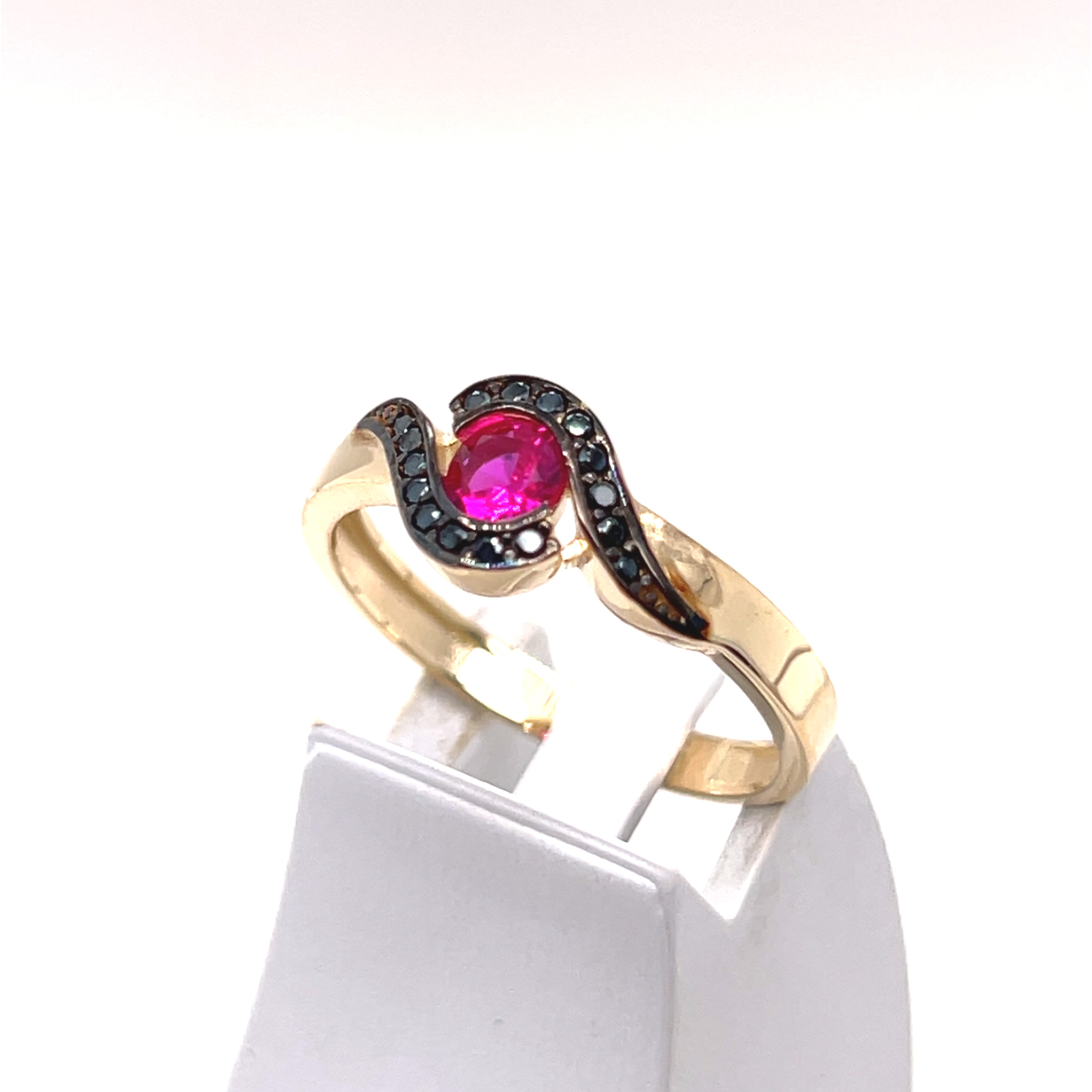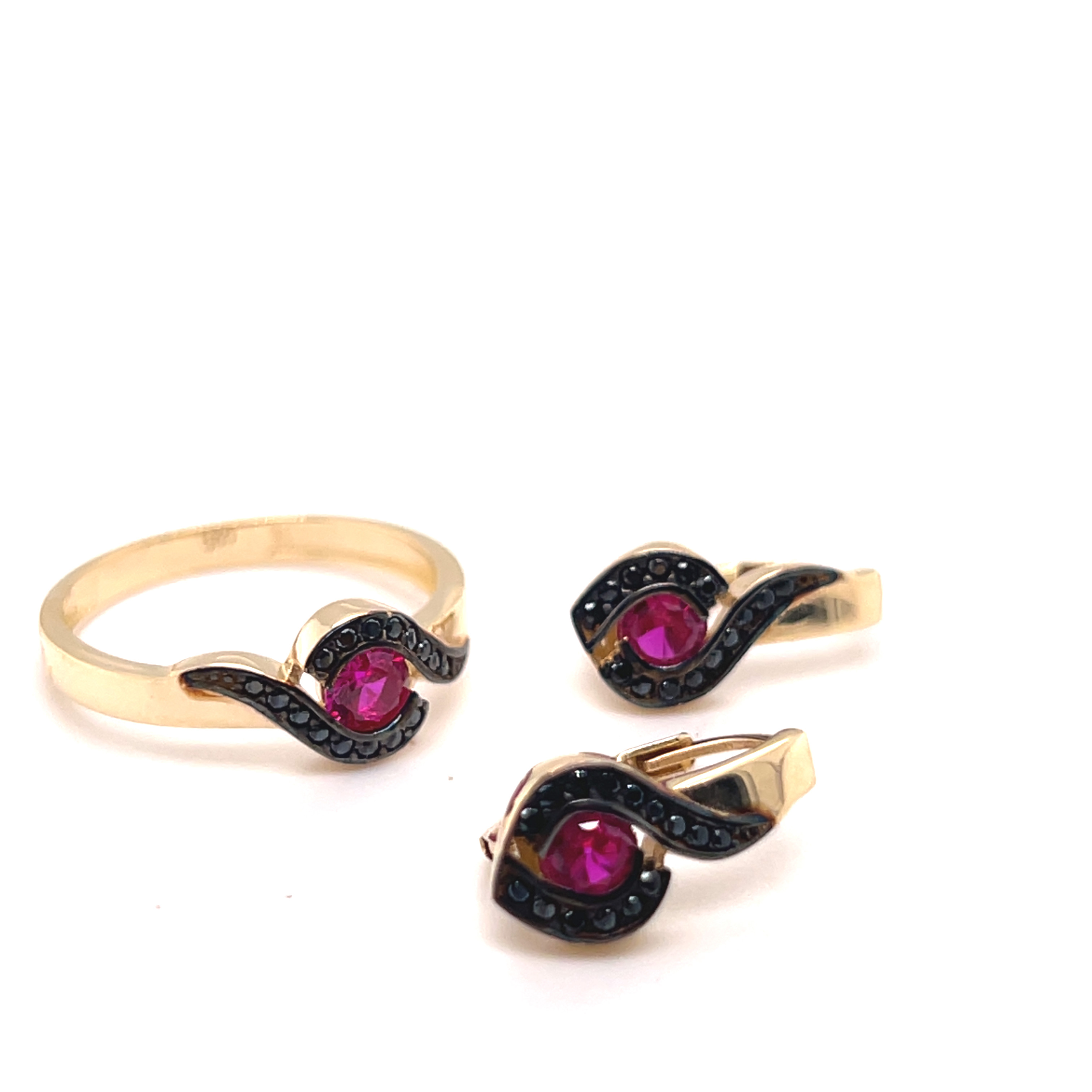 Комплект обеци и пръстен от “Jacklin hugasian” в жълто злато с оникс и синтетичен рубин