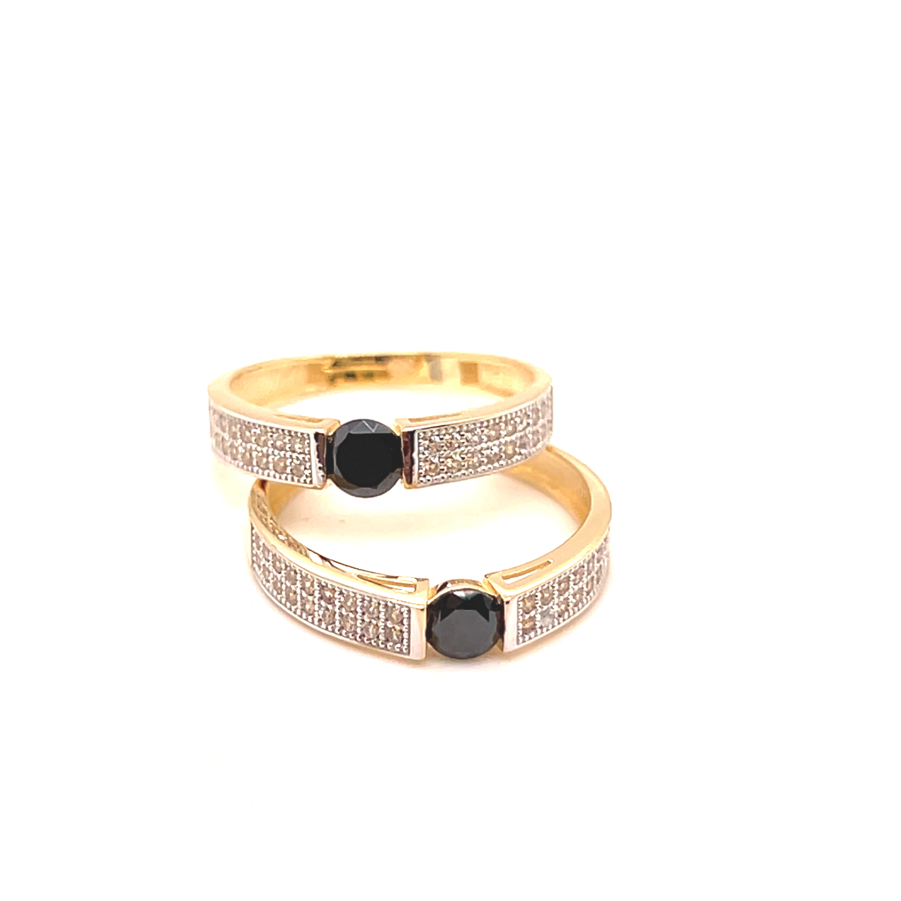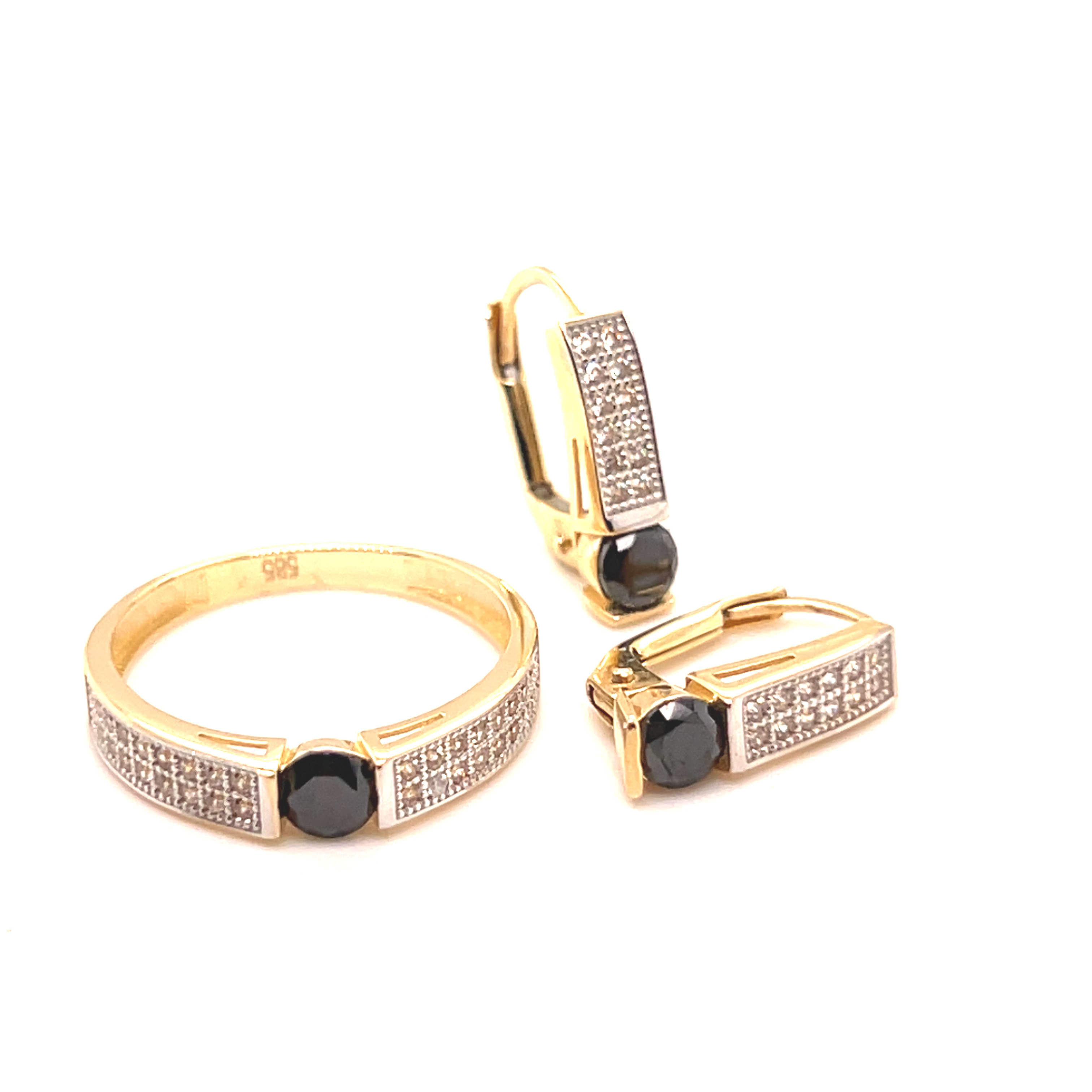 Комплект обеци и пръстен от “Jacklin hugasian” в жълто злато с оникс и циркони