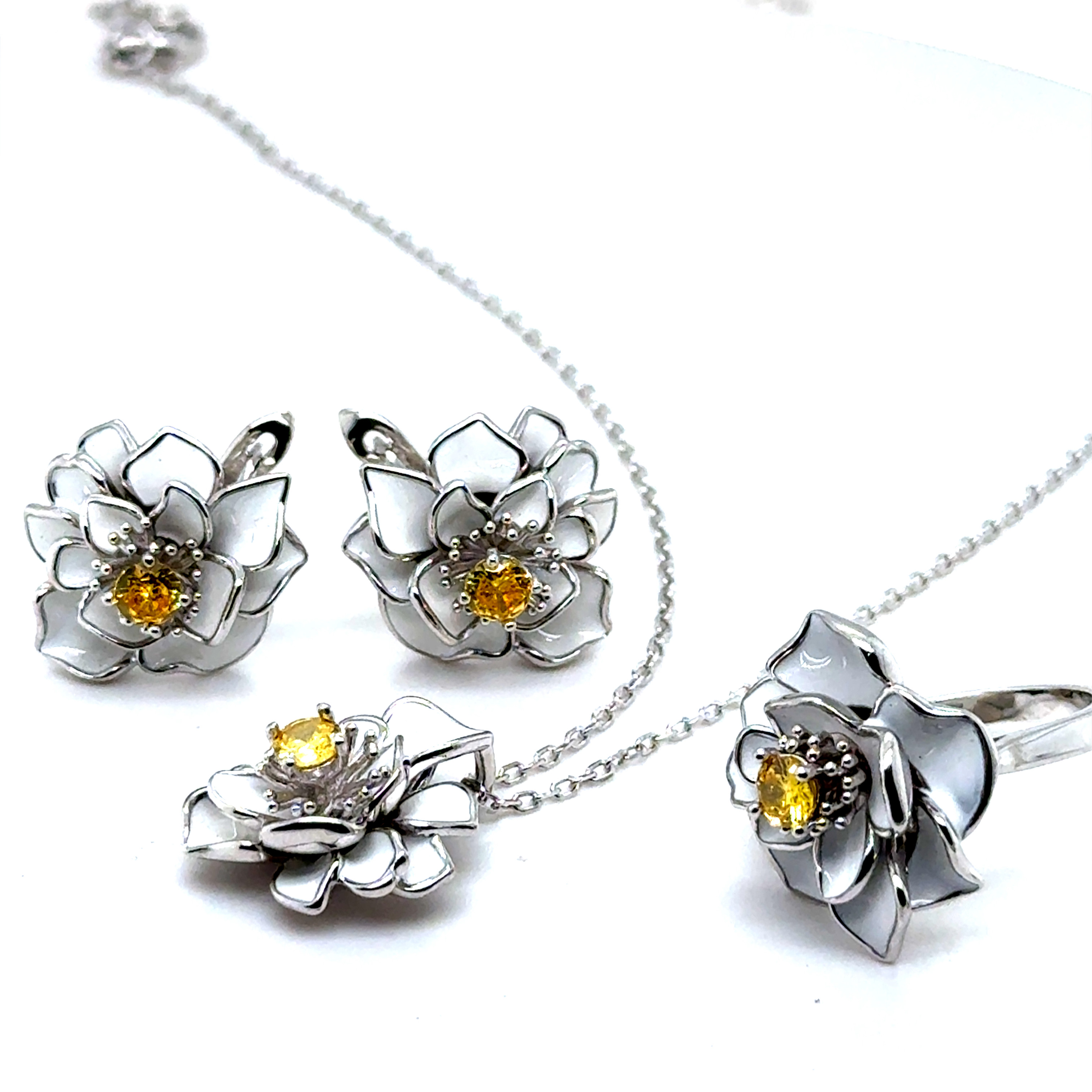 Комплект колие, обеци и пръстен от “Jacklin hugasian” в сребро с цитрин и емайл.