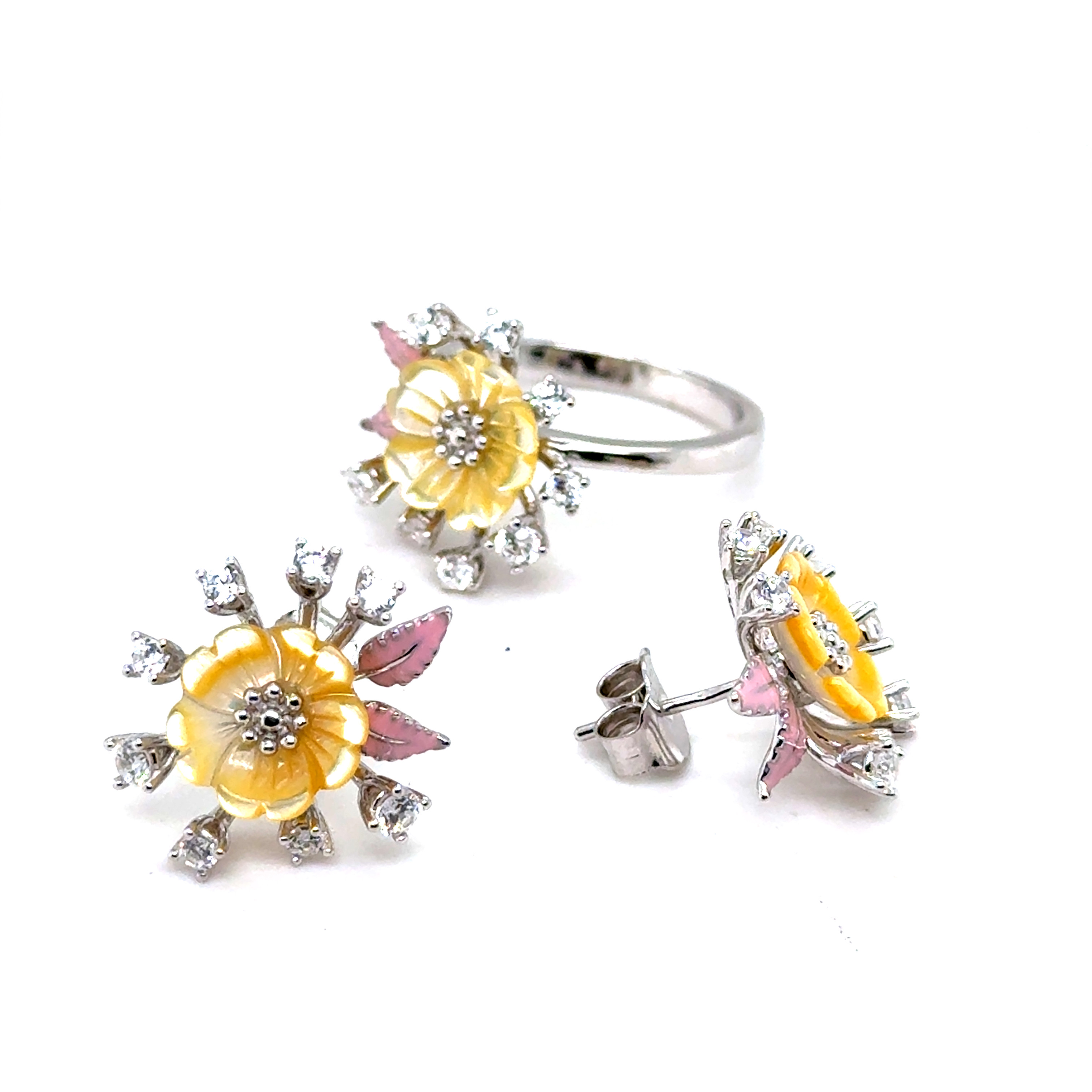Комплект колие, обеци и пръстен от “Jacklin hugasian” в сребро с циркони, седеф и цветен емайл.