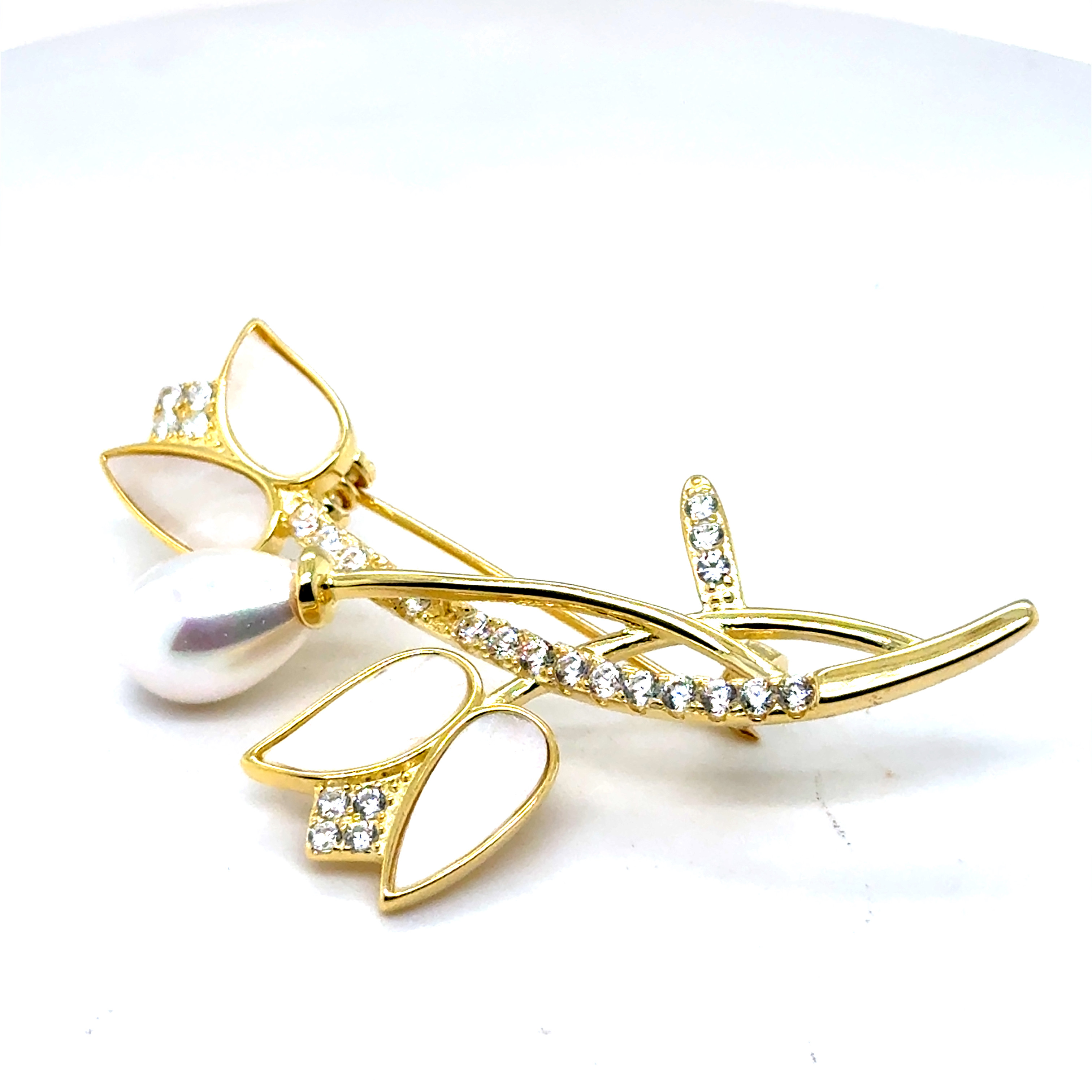 Брошка от ”Jacklin hugasian” в сребро с позлата с естествен седеф,циркони и естествена перла.