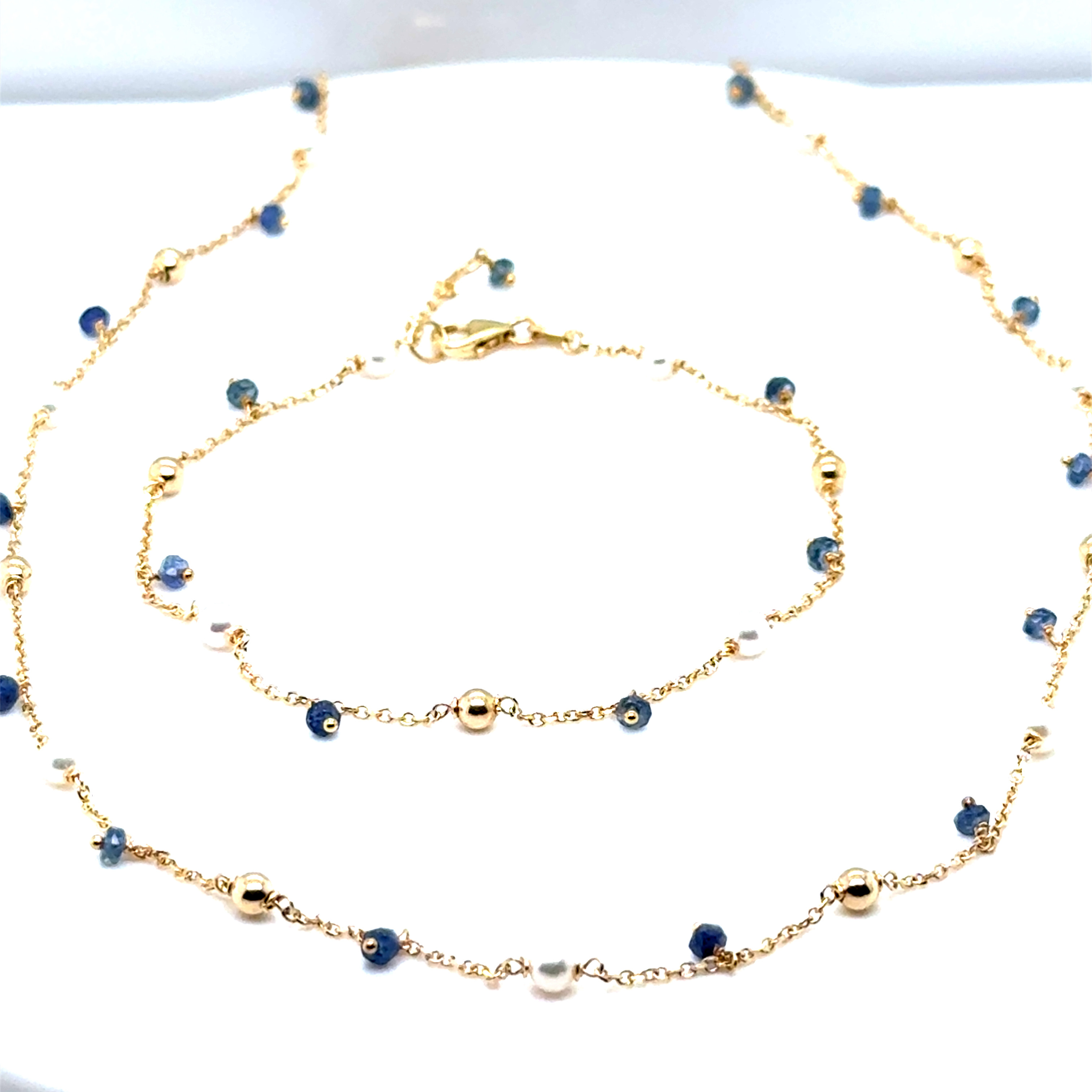 Комплект колие и гривна от “Jacklin hugasian” в жълто злато с естествени перли и сапфири