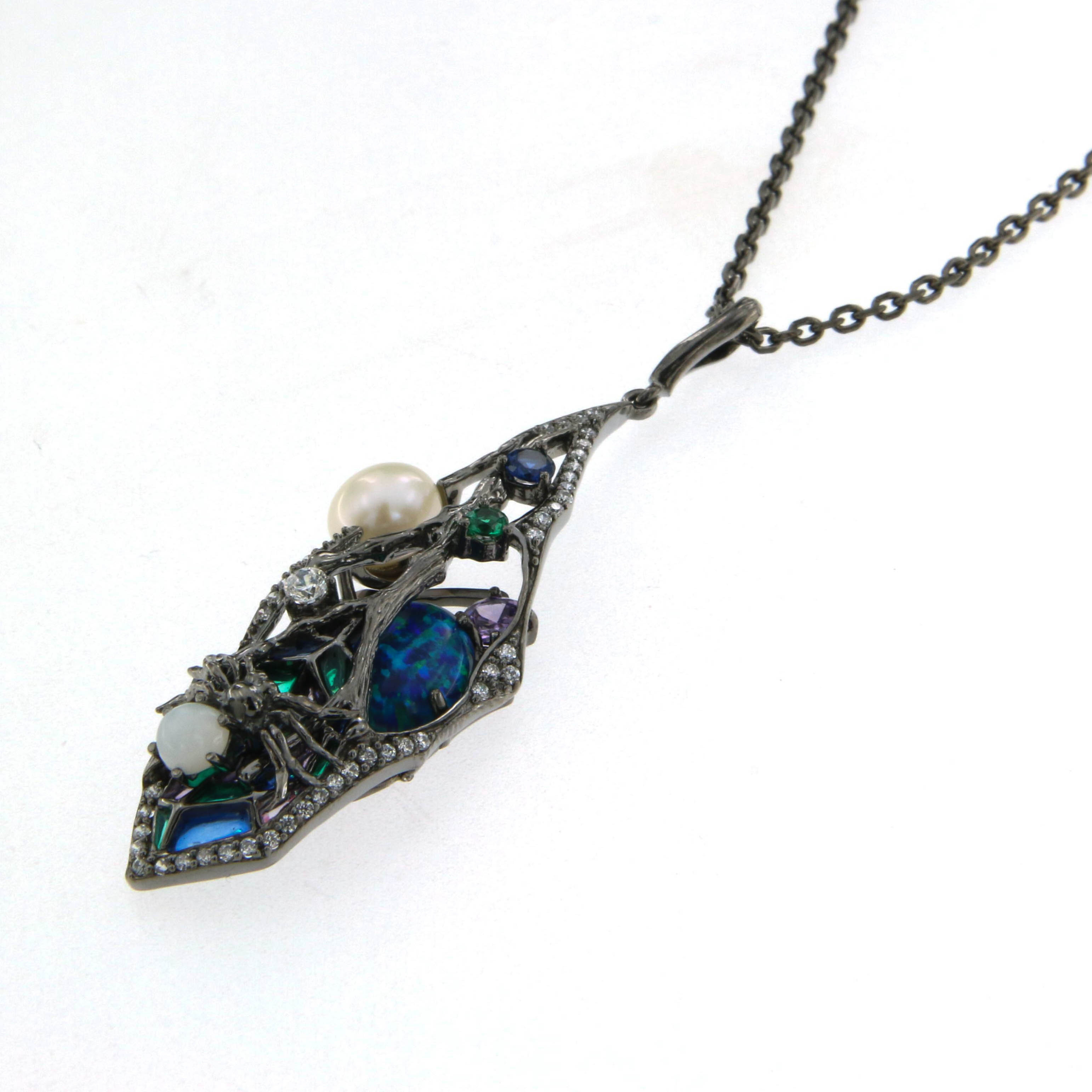 Колие от "Jacklin hugasian" в оксидирано сребро с разноцветен емайл с перла, опал, котешко око, изумруд, сапфири, аметист и циркони.