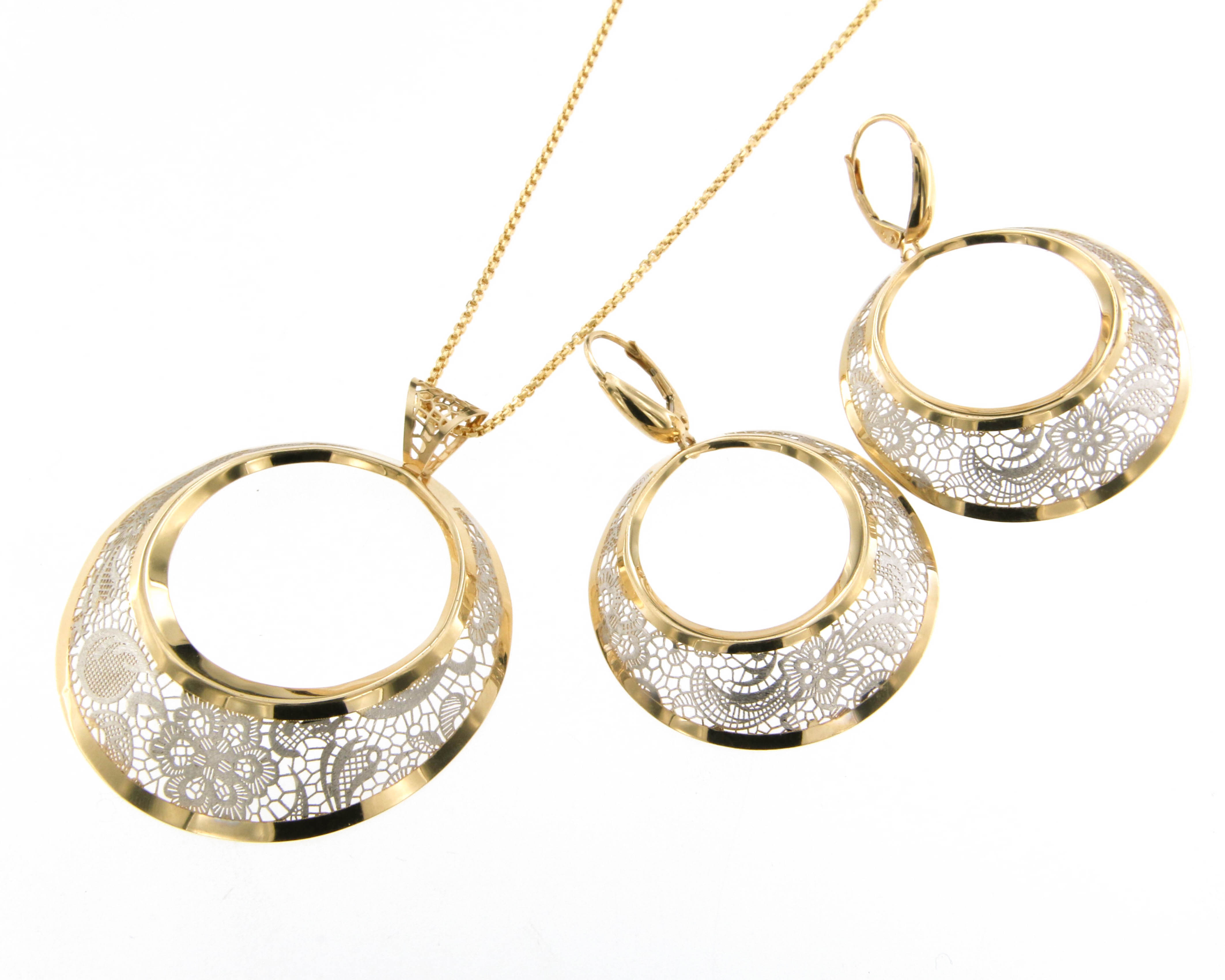 Комплект колие и обеци от " Jacklin hugasian " в бяло и жълто злато. Произход Италия.