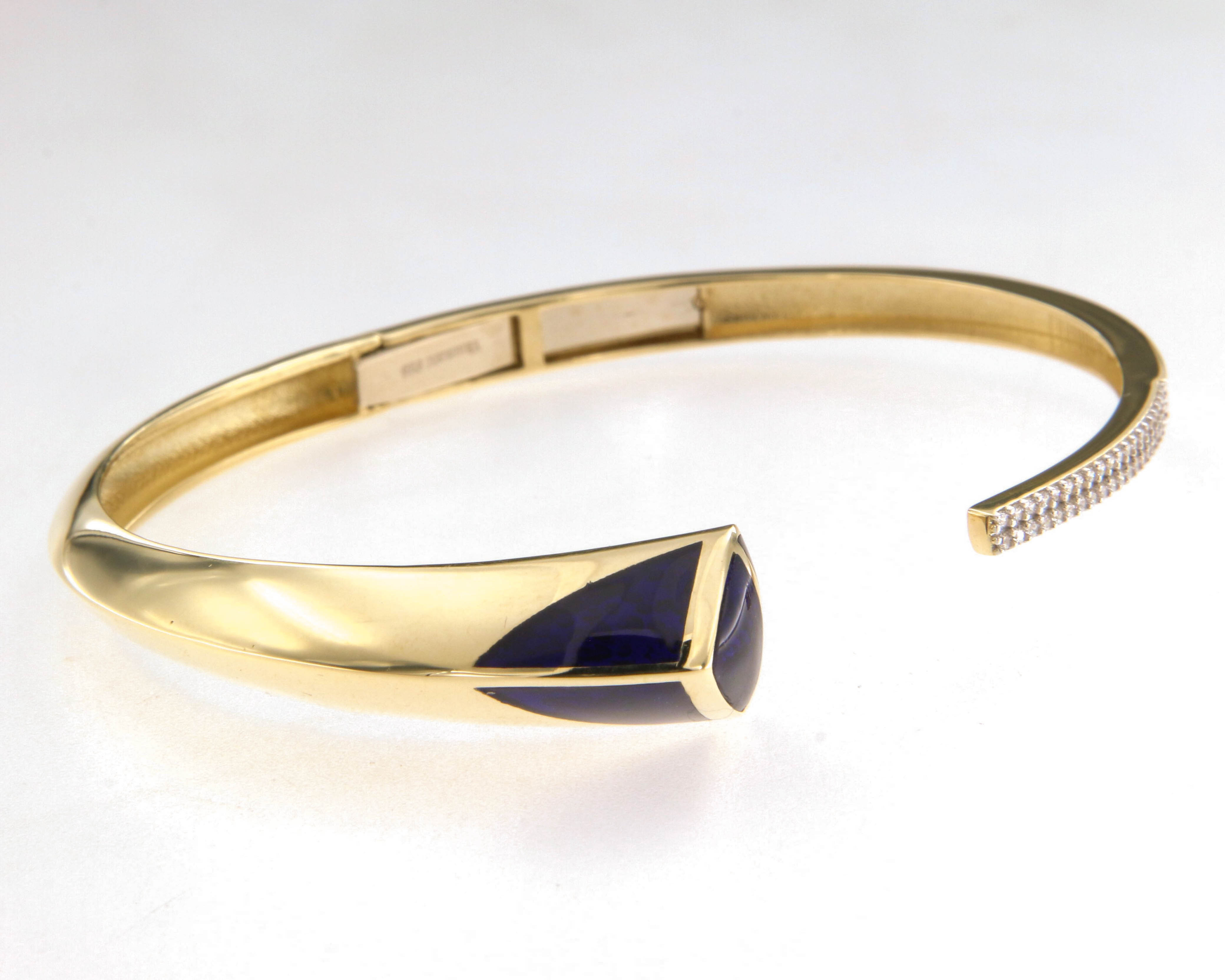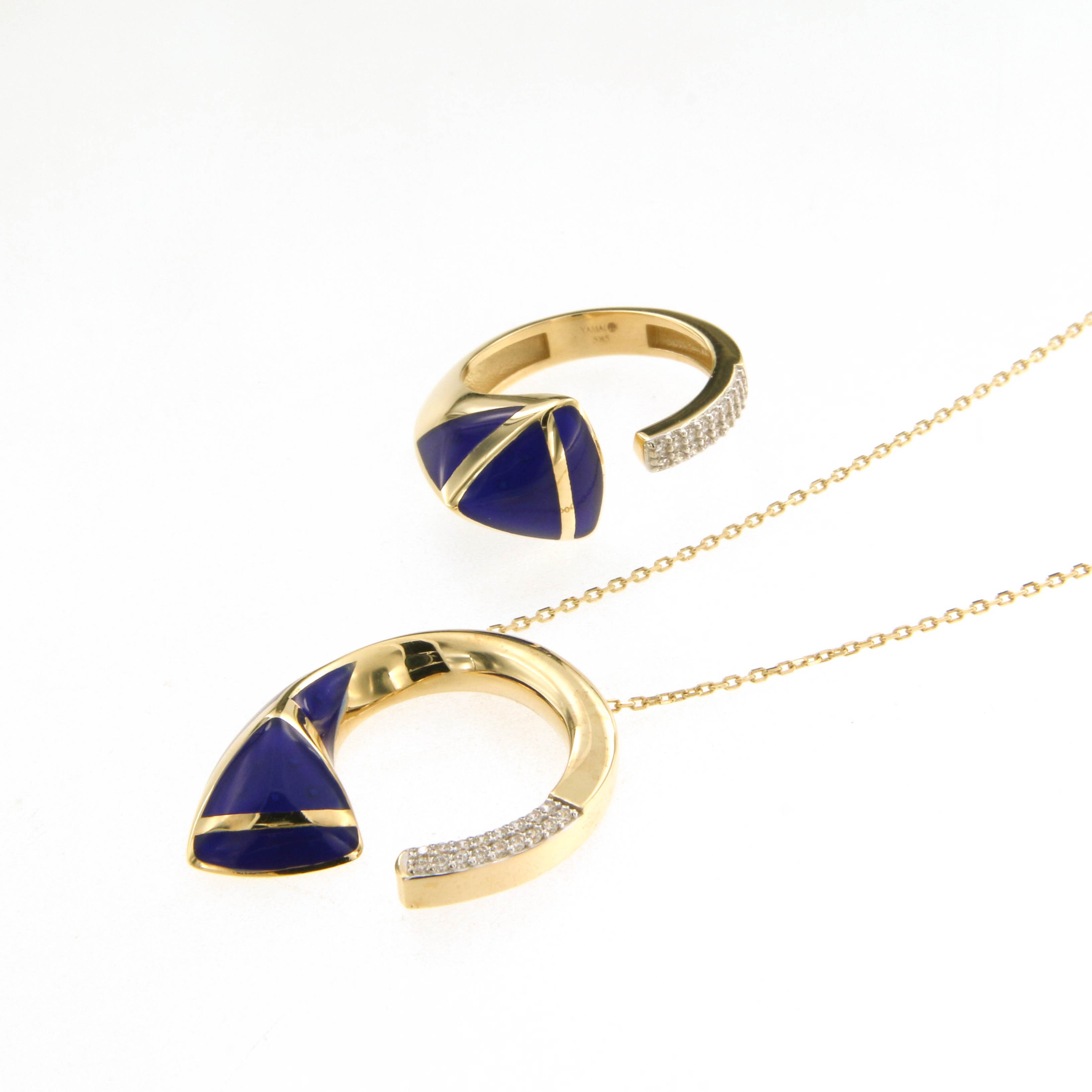 Комплект колие, пръстен и гривна тип белезник от “Jacklin hugasian” в жълто гланц с цветен емайл и циркони.