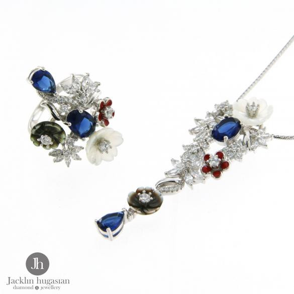 Колие от "Jacklin hugasian" в сребро със седеф, кралски седеф, цветен емайл , циркон и сапфир.