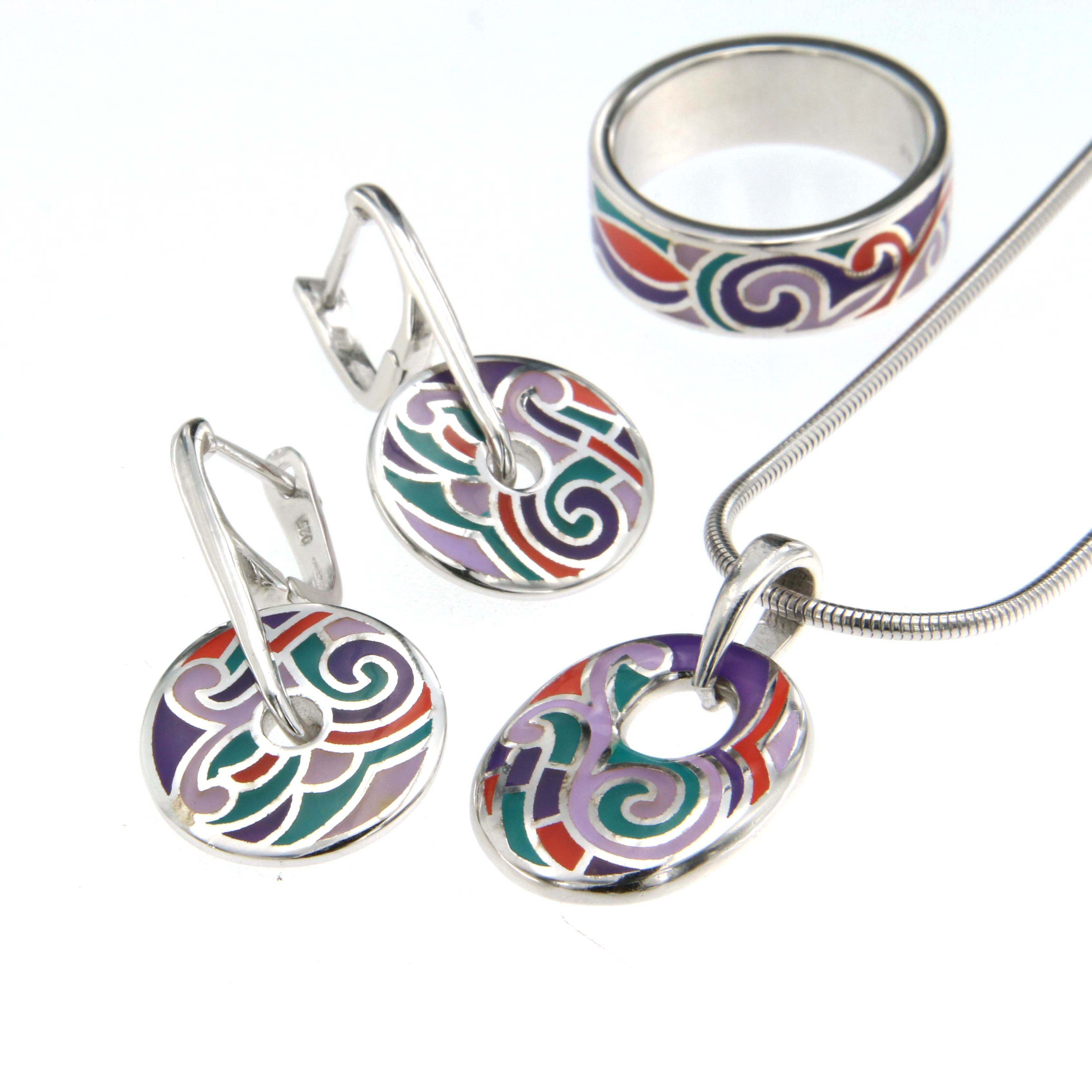 Комплект пръстен и колие от "Jacklin hugasian" в сребро с цветен емайл. Колекция "TITI". Дължина колие 55 см.