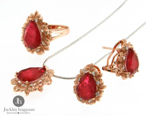 Комплект пръстен и висулка от " Jacklin hugasian " в розово сребро ,мат и гланц, с цирконии и червен рубин