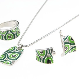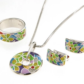 Комплект пръстен, колие и обеци от “Jacklin hugasian” в сребро с разноцветен емайл.