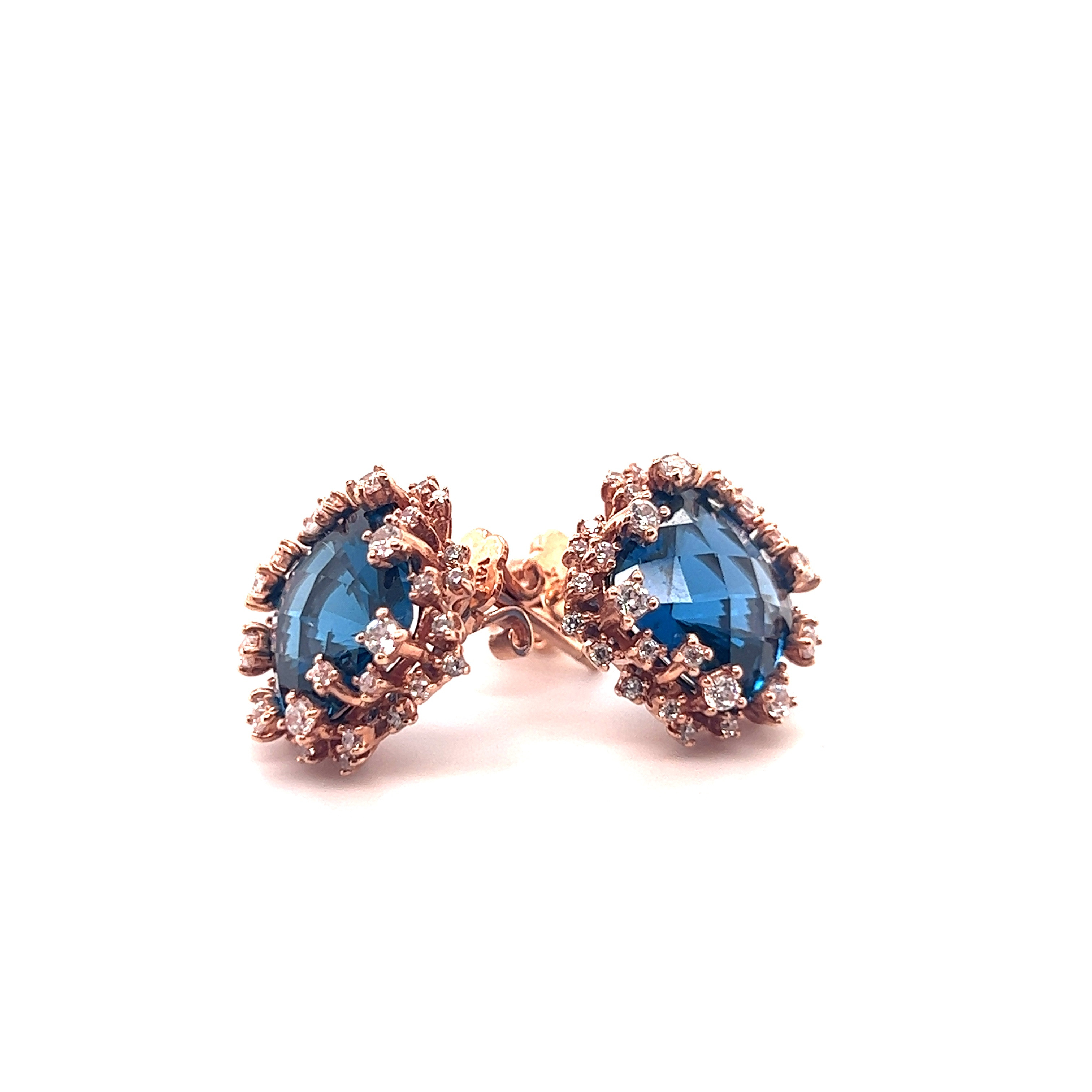 Обеци от “Jacklin hugasian” в розово злато с Лондон топаз и цирконии.