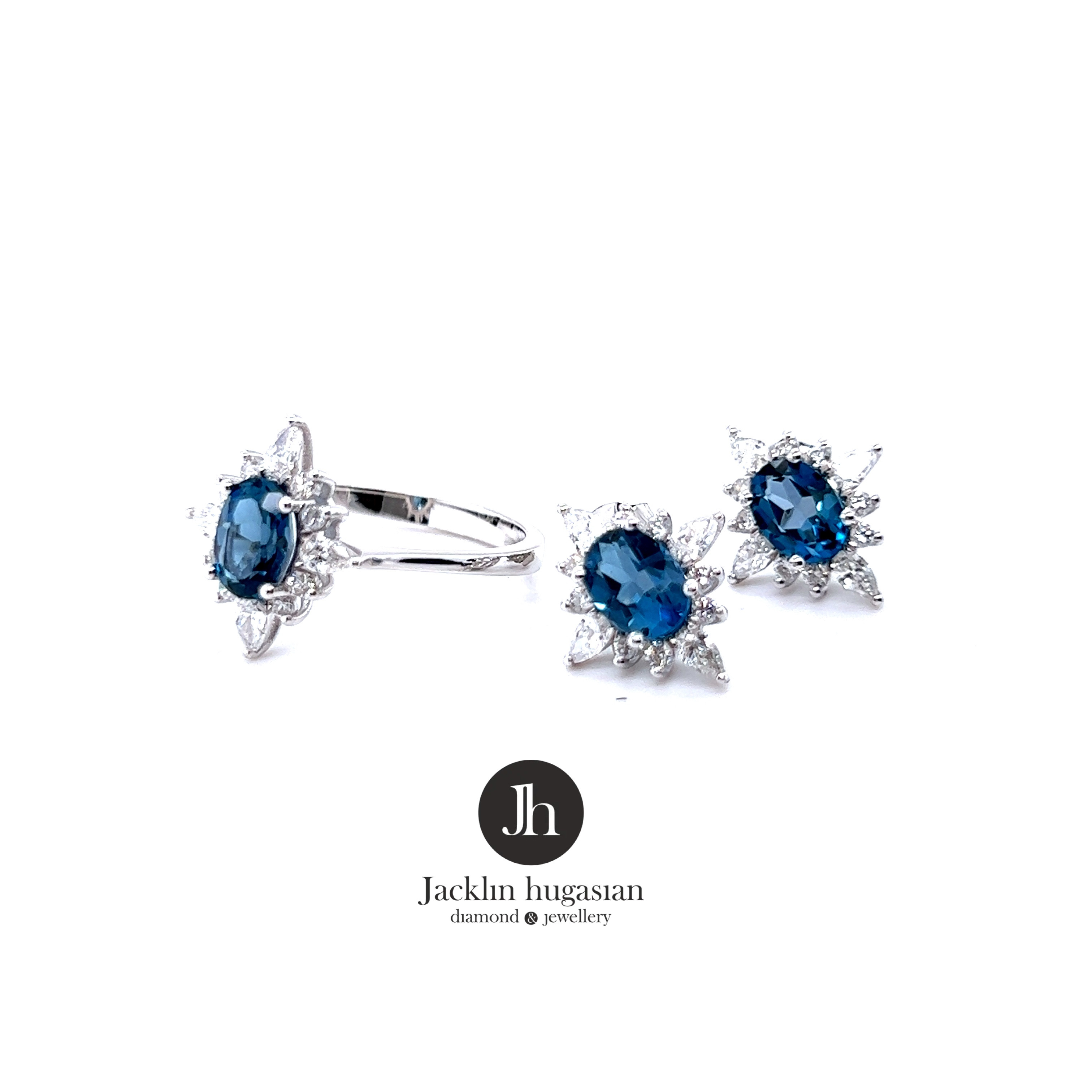 Обеци от “Jacklin hugasian” в бяло злато с лондон топаз и диаманти.