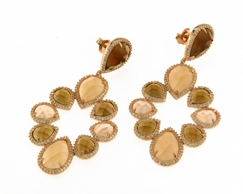 Обеци от "Jacklin hugasian" в розово сребро с цирконии, опушен топаз, златист топаз, бледо розов кварц.