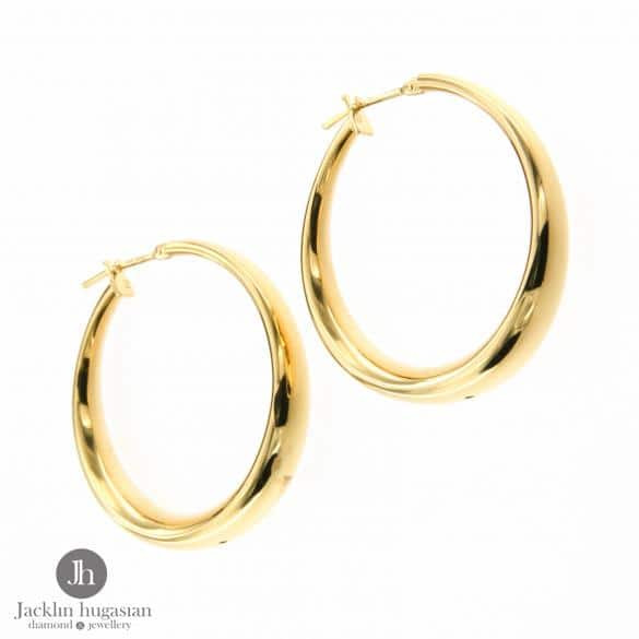 Обеци от " Jacklin hugasian " в жълто злато,олекотени,гланц.Дължина обеци 3.02 см., широчина --обеци 0.6 см.Колекция " Fiore D'oro ".Произход Италия.