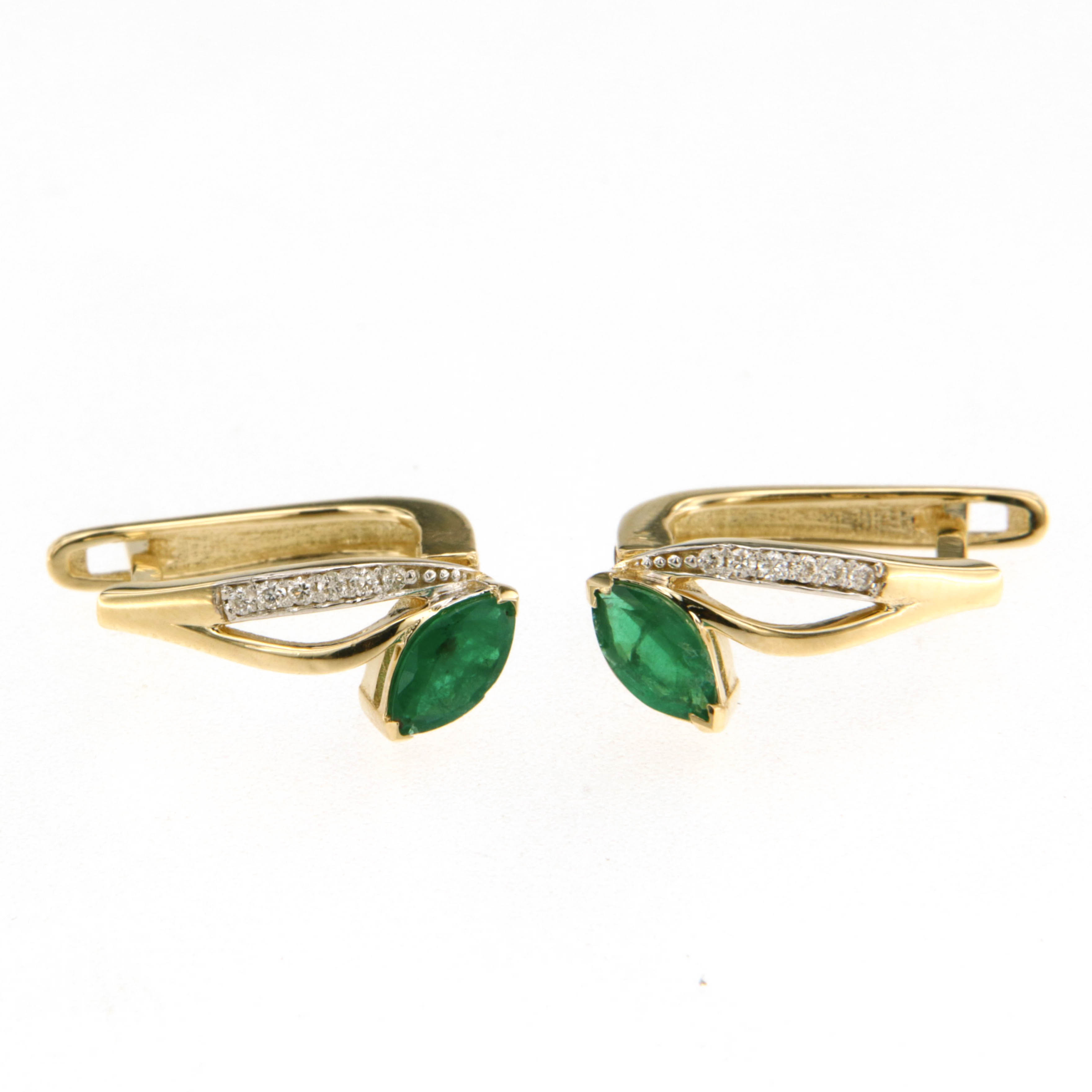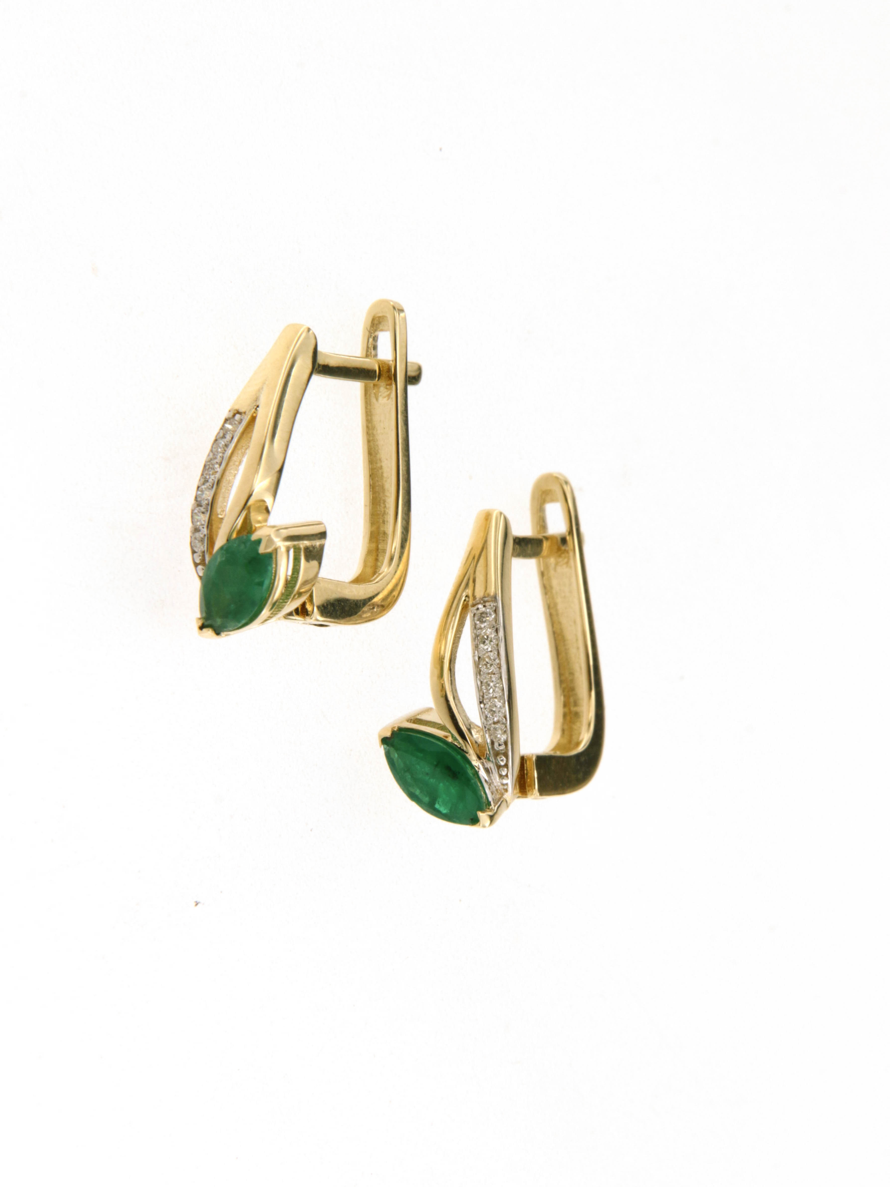 Обеци от "Jacklin hugasian" жълто злато с изумруд и диаманти. Дължина 1.4 см., широчина 1.00 см.