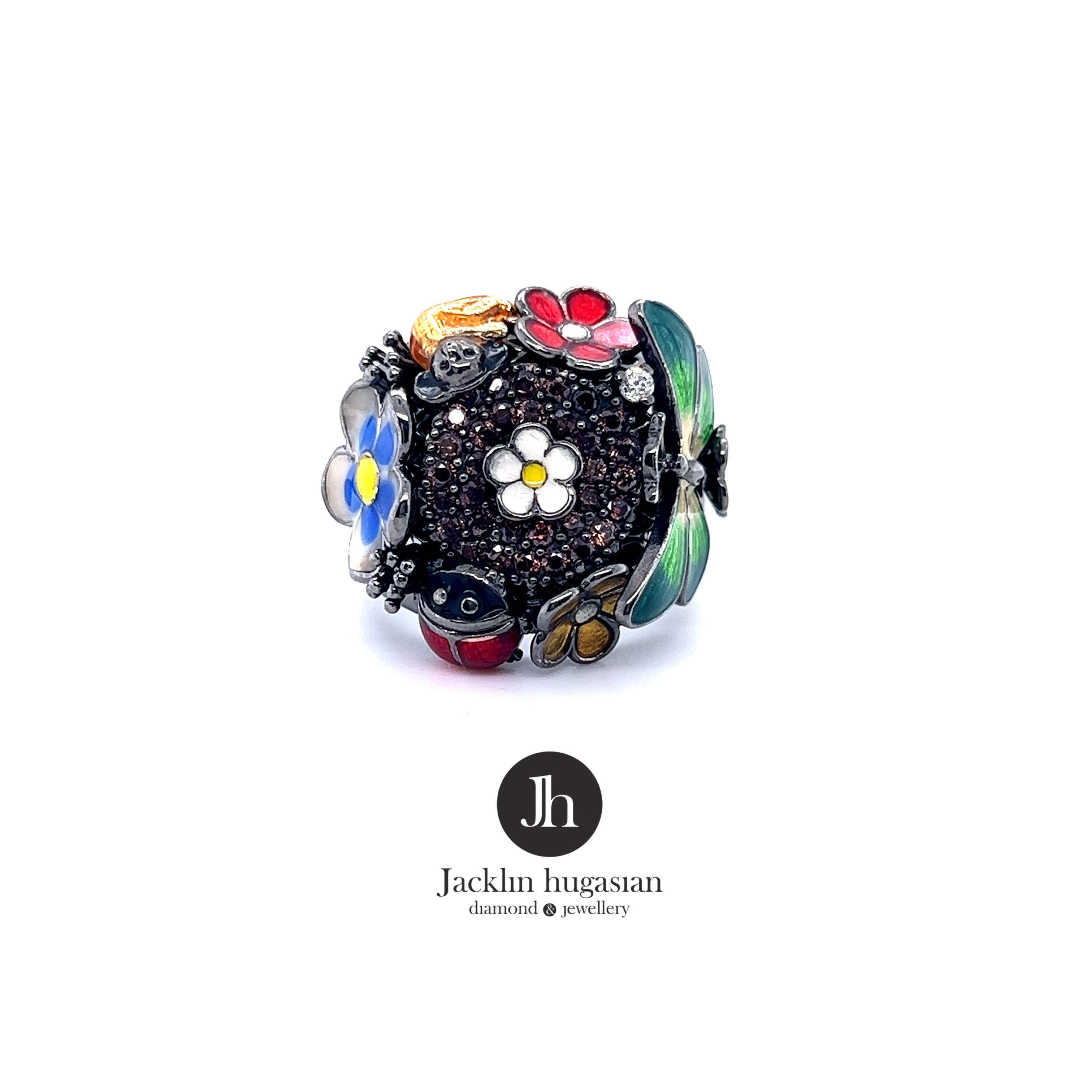 Пръстен от "Jacklin hugasian" в сребро с цветен емайл, топази и цирконии .