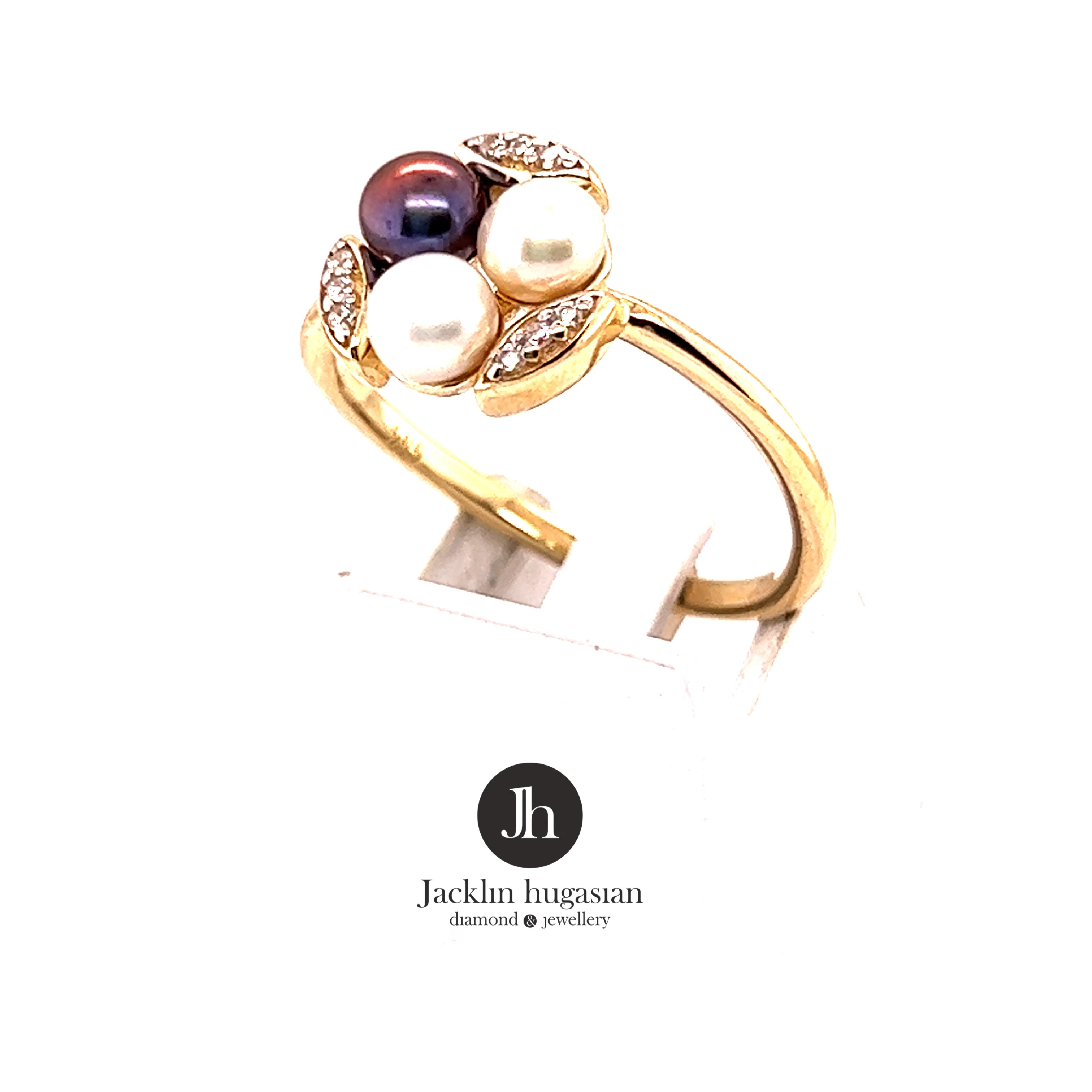 Пръстен от “Jacklin hugasian” в жълто злато с перли и циркони.