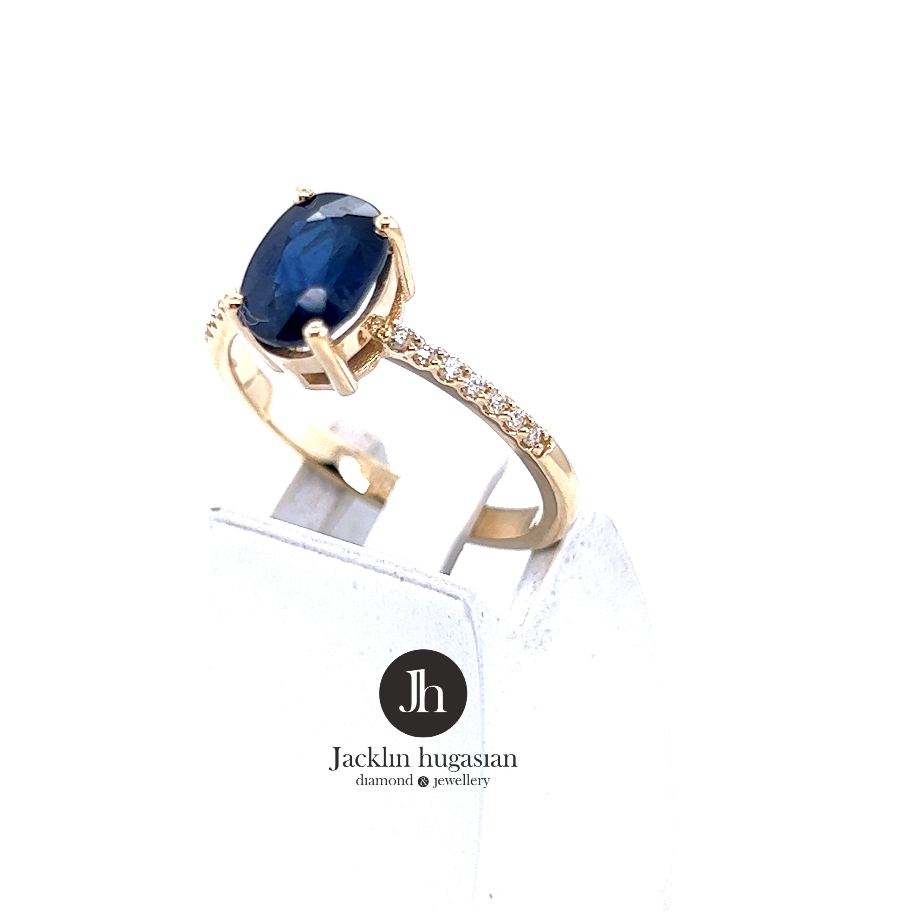 Пръстен от “Jacklin hugasian” в жълто злато с сапфир и диаманти.
