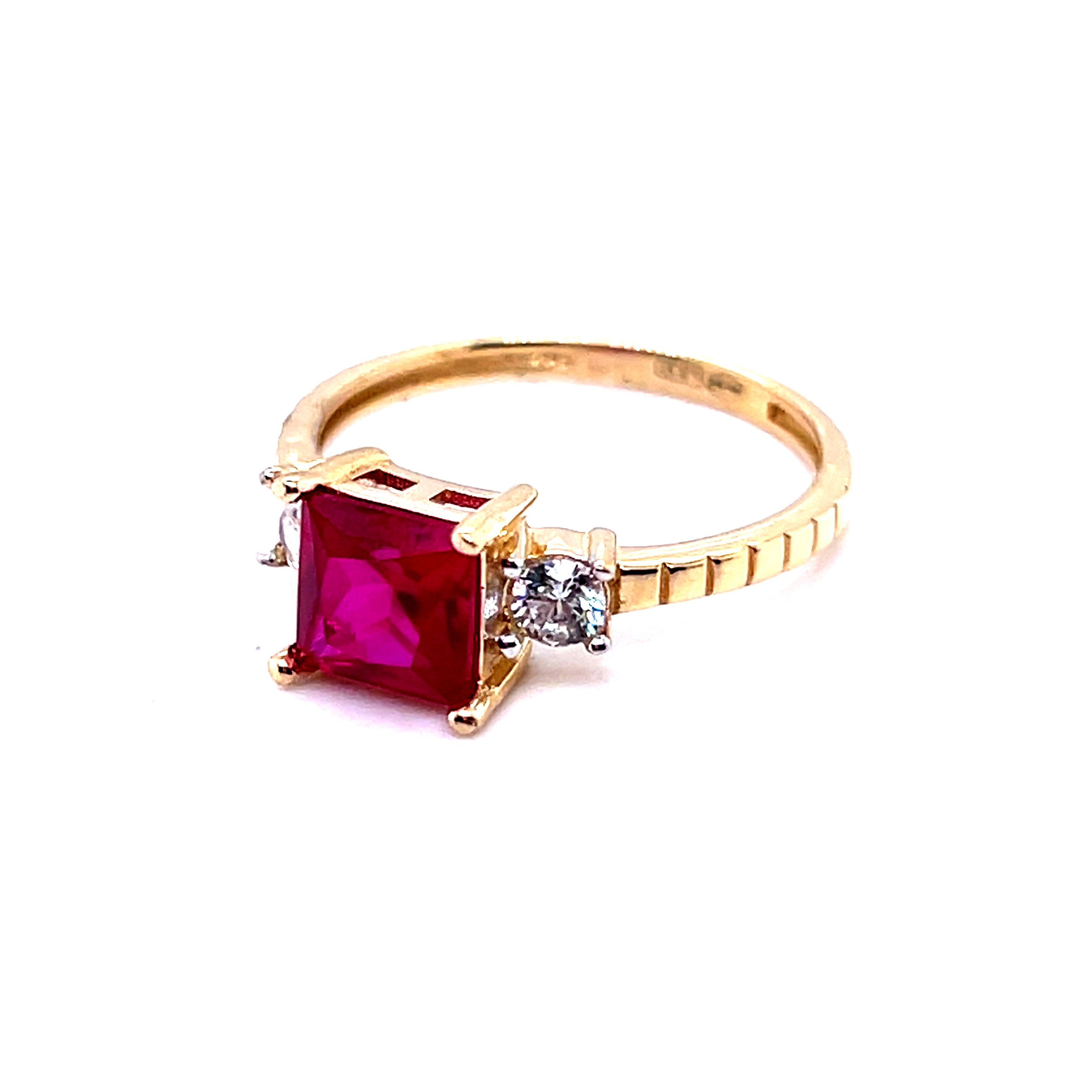 Пръстен от “Jacklin hugasian” в жълто злато със синтетичен рубин.