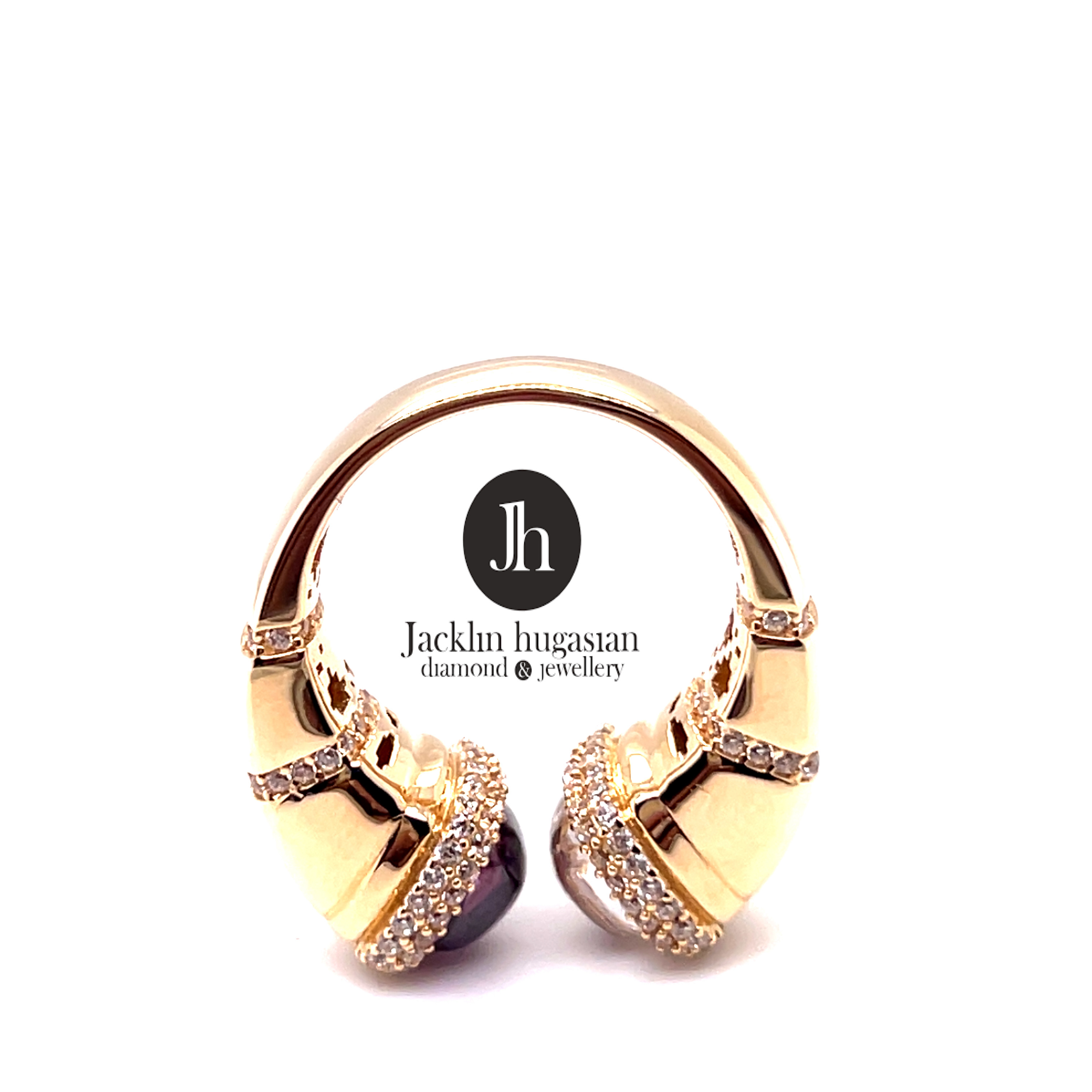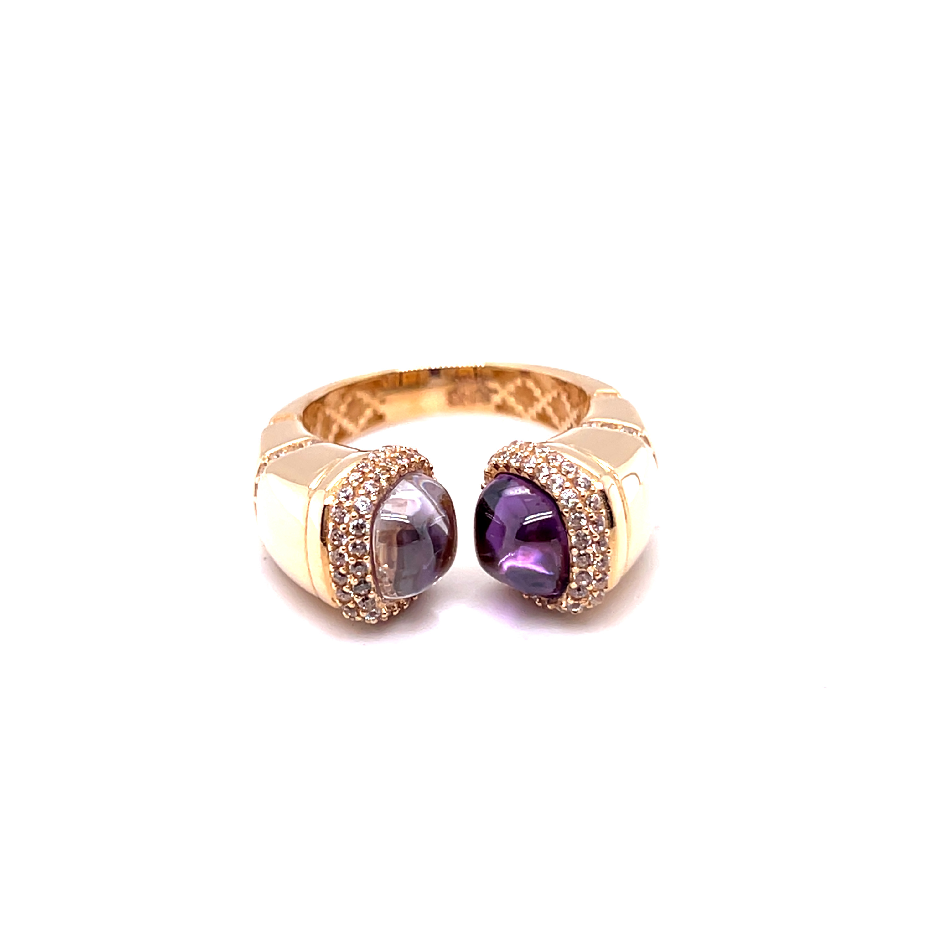 Пръстен от “Jacklin hugasian” в жълто злато гланц с аметист, розов кварц и циркони.