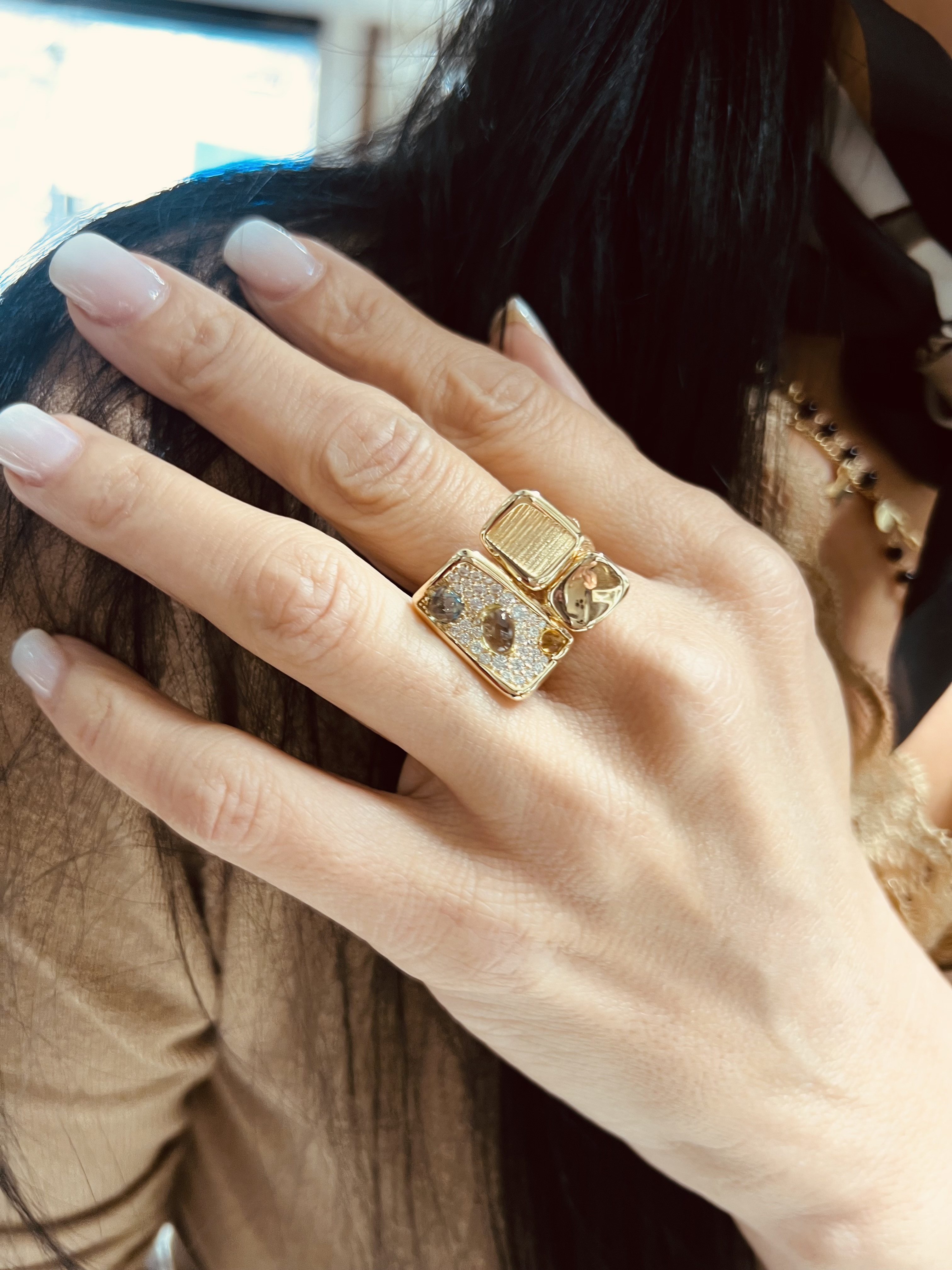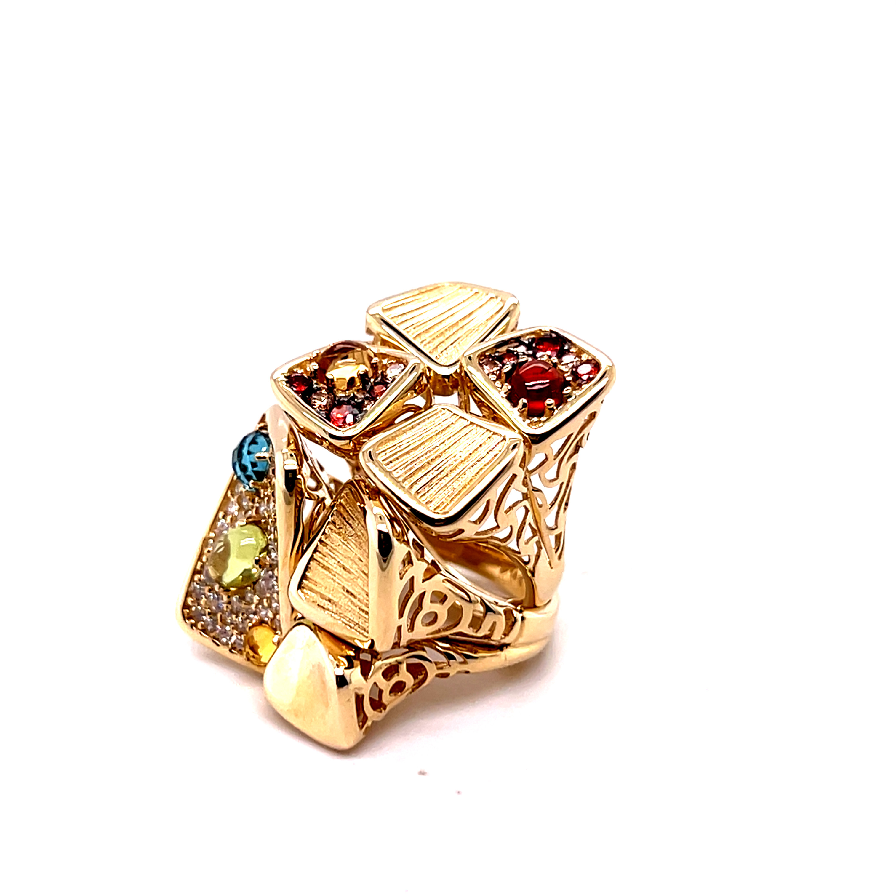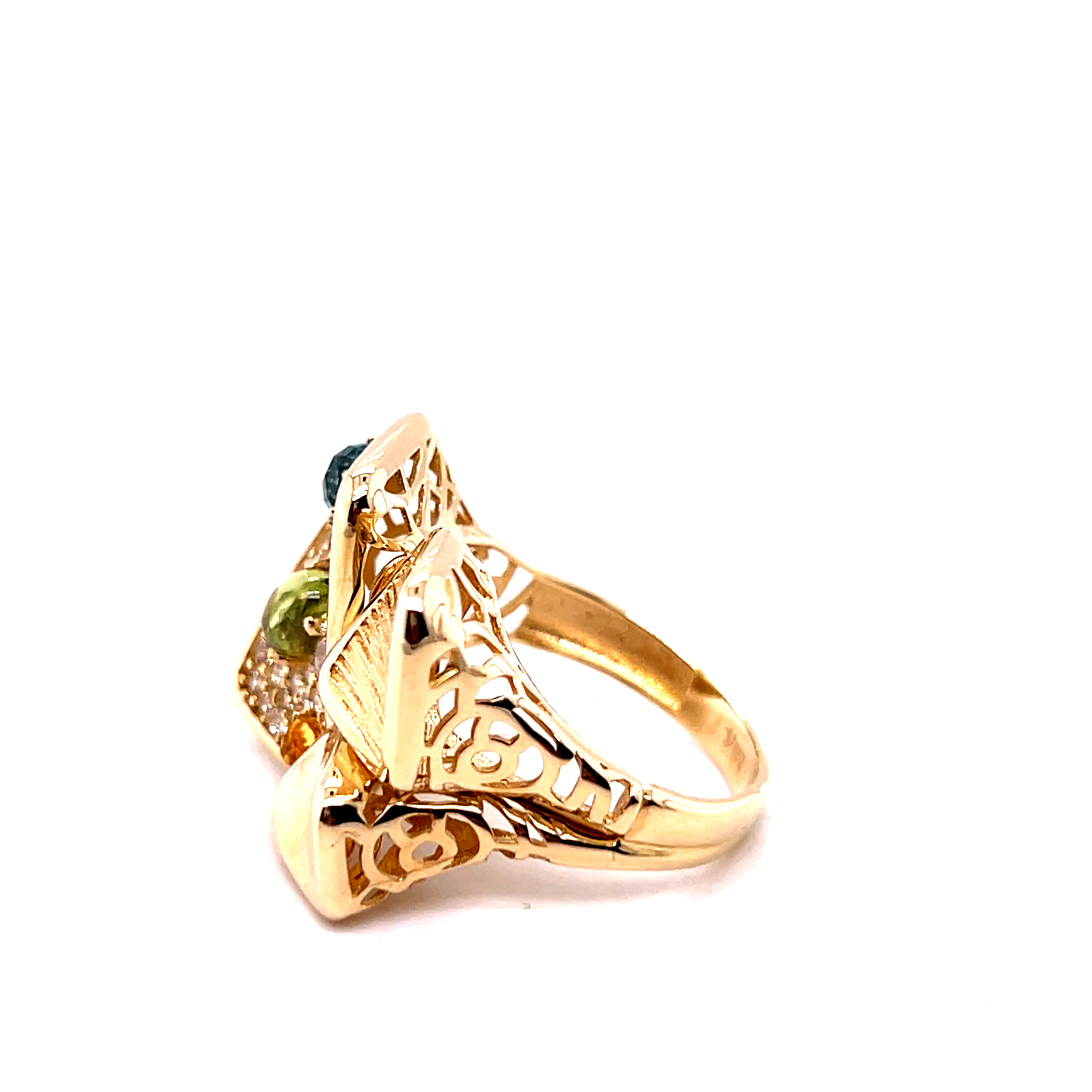 Пръстен от "Jacklin hugasian" в жълто злато с перидот, златист и син топаз, циркони.