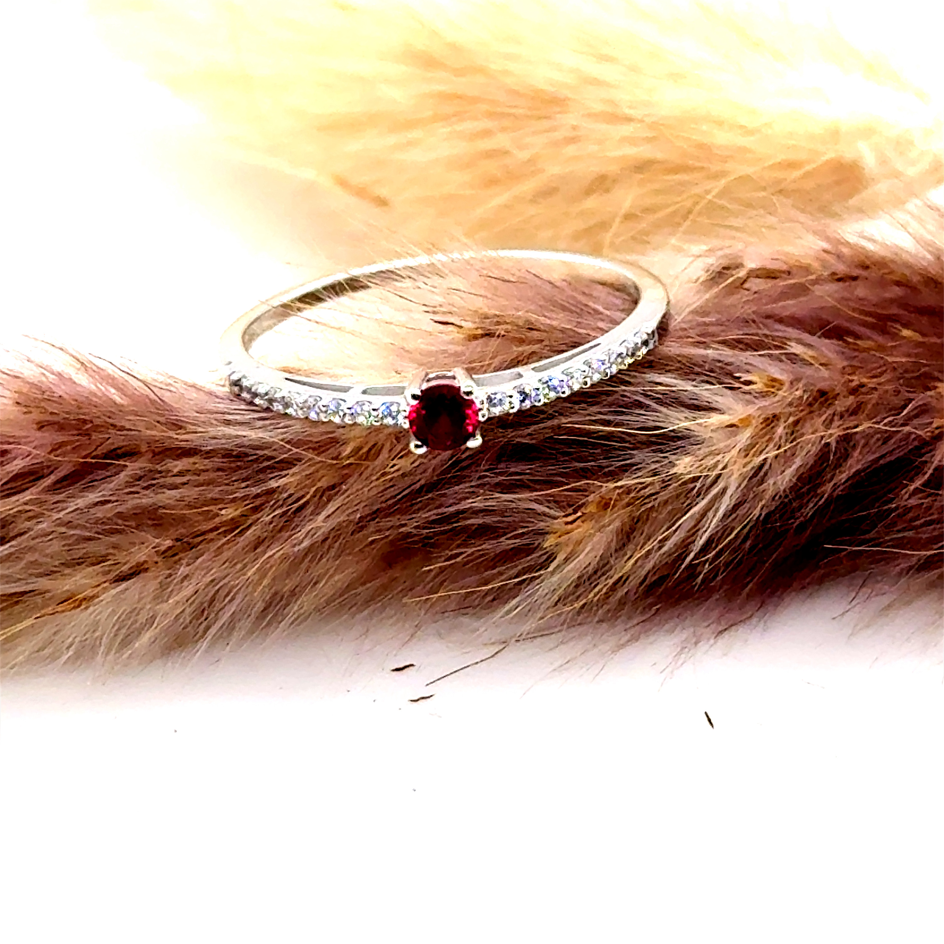 Пръстен от “Jacklin hugasian” в бяло злато гланц с циркони и синтетичен рубин.