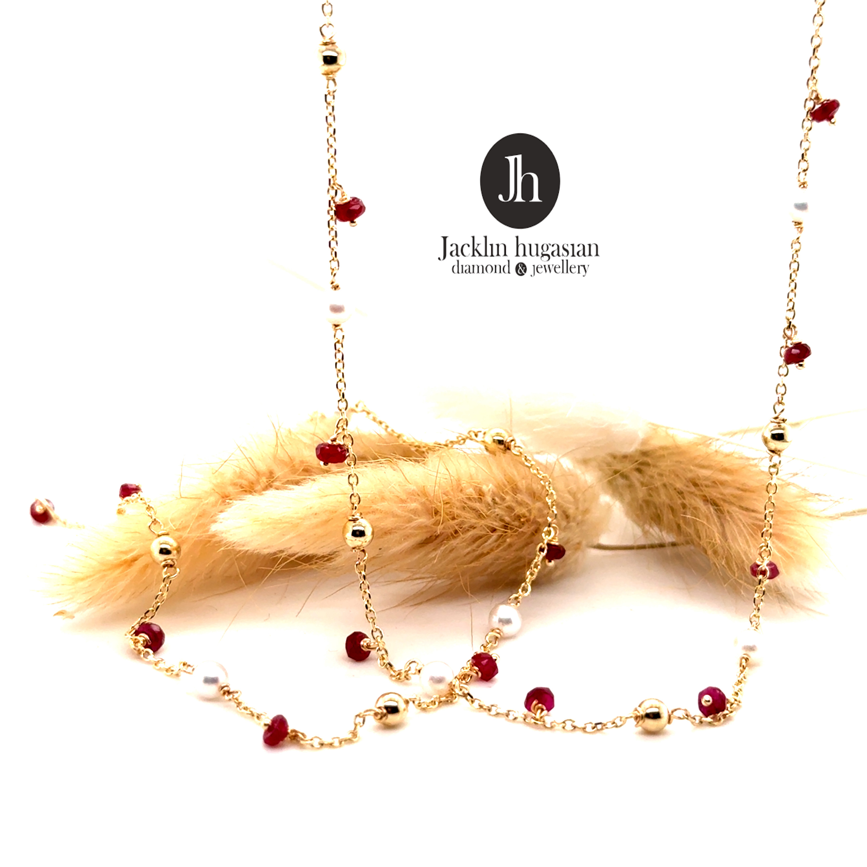 Комплект колие и гривна от “Jacklin hugasian” в жълто злато с естествени перли и рубин