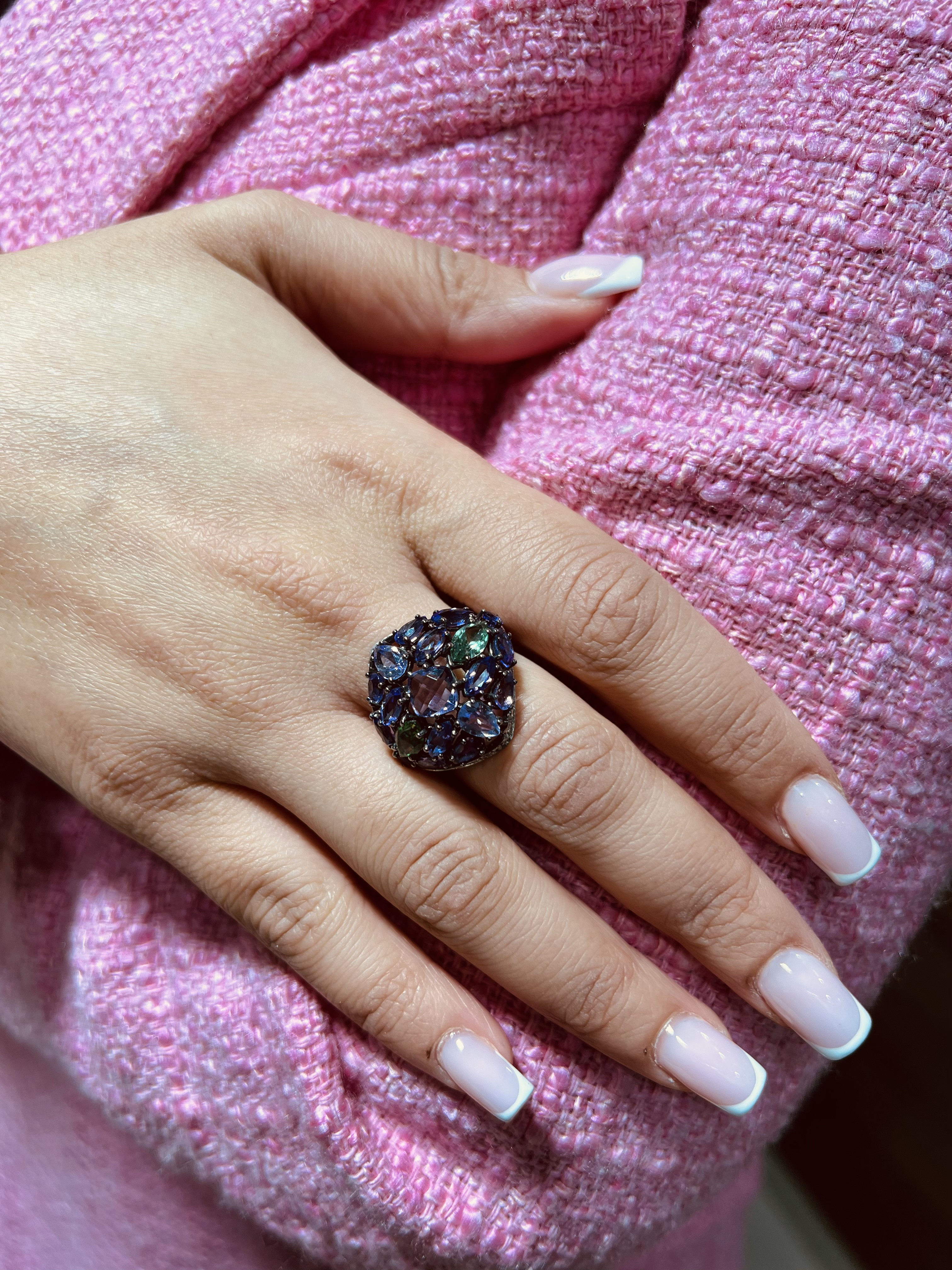 Пръстен от “Jacklin hugasian” черно злато с диаманти, аметист и турмалин.
