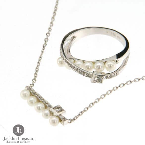 Пръстен от " Jacklin hugasian " в бяло злато с цирконии и култивирани бели перли.