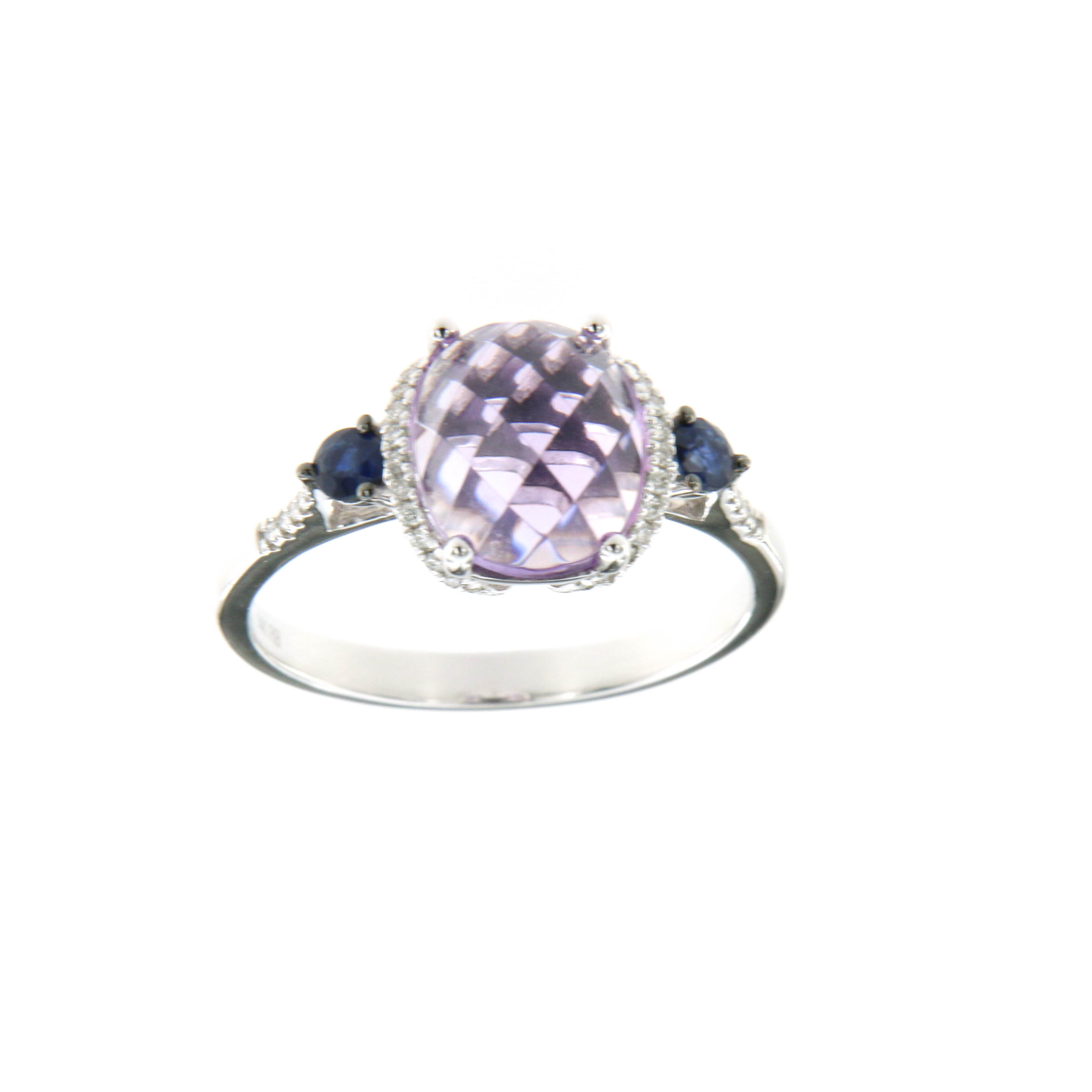 Пръстен от "Jacklin hugasian" в бяло злато с диаманти, естествен сапфир и лилав аметист.