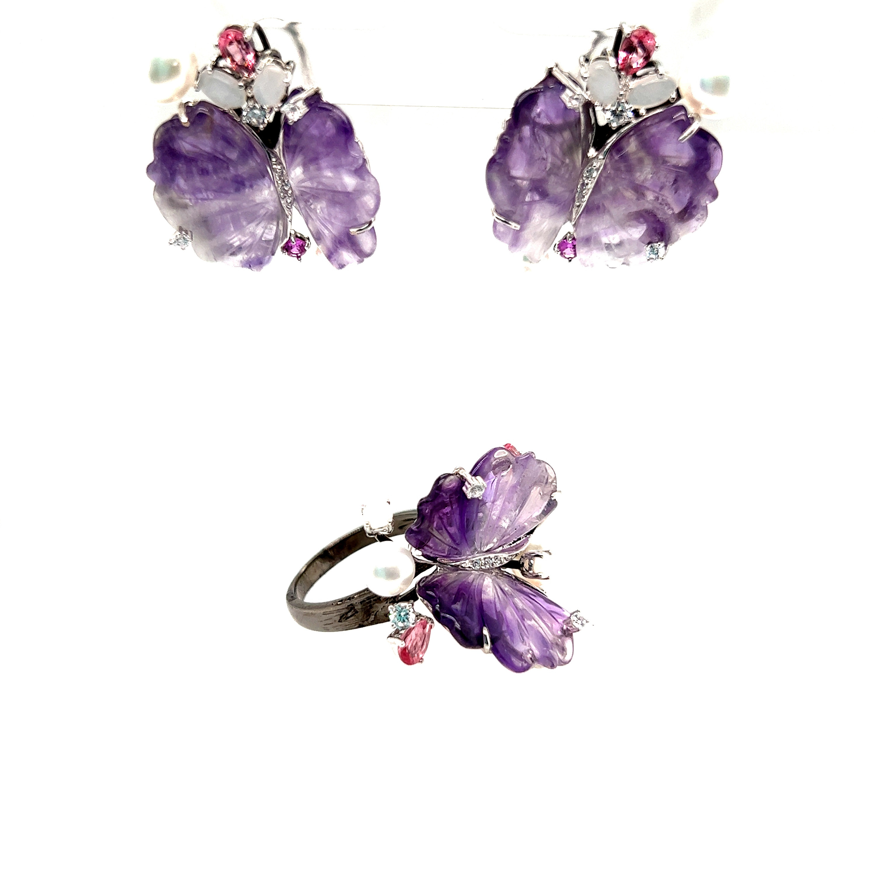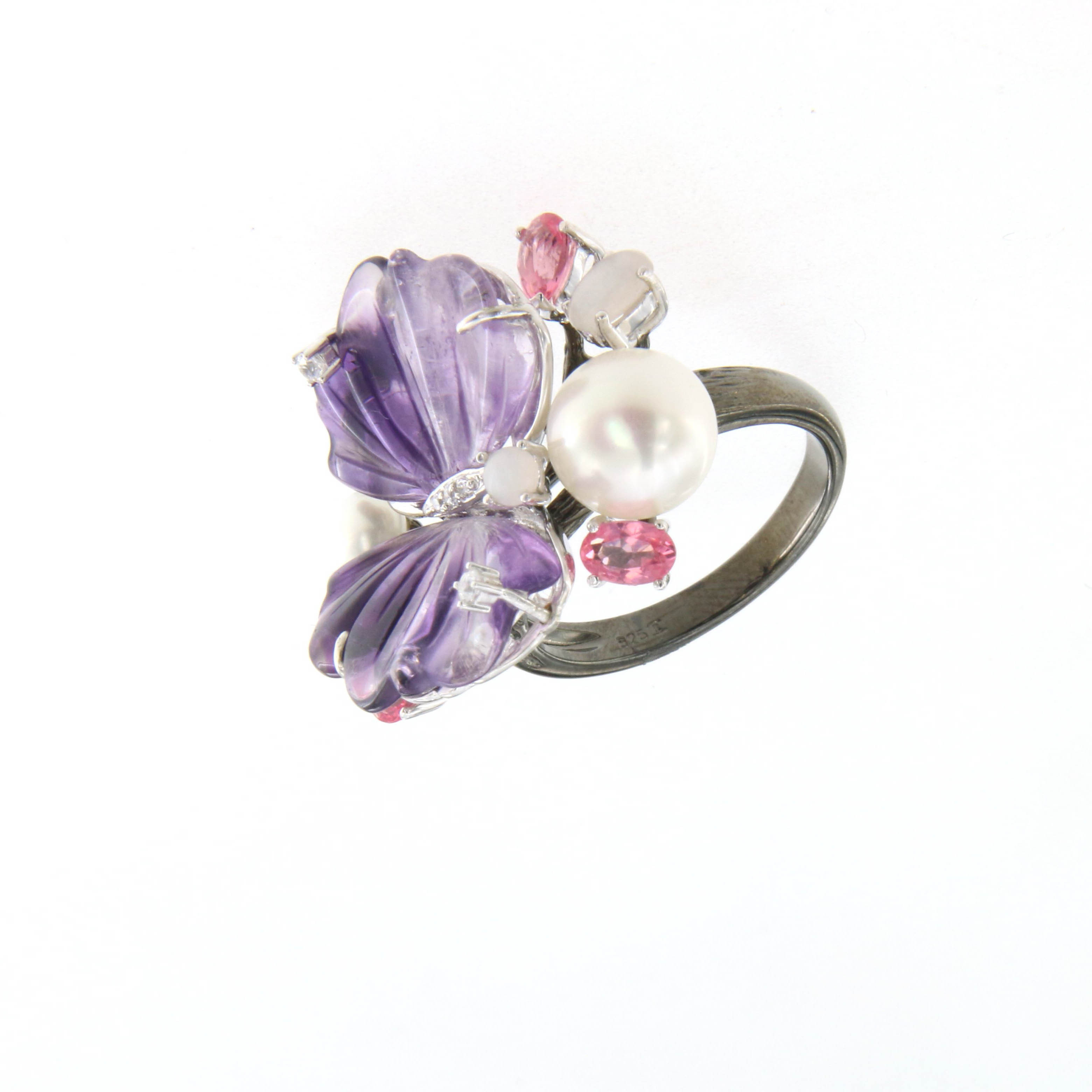 Пръстен от ”Jacklin hugasian” в оксидирано сребро с аметист, естествена перла, ахат, турмалин, розов кварц и цирконии.