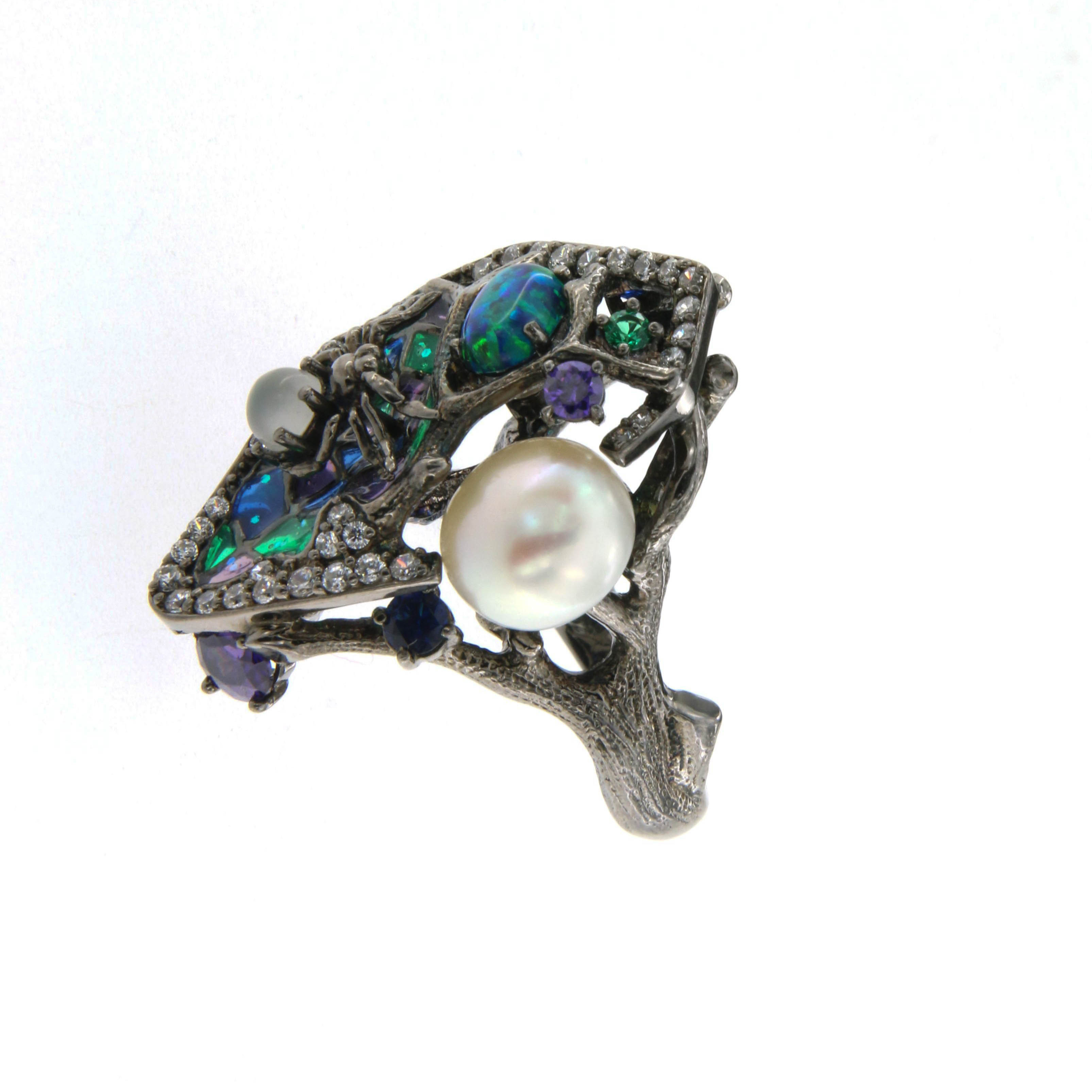 Пръстен от "Jacklin hugasian" в оксидирано сребро с разноцветен емайл с перла, опал, котешко око, изумруд, сапфири, аметист и циркони.