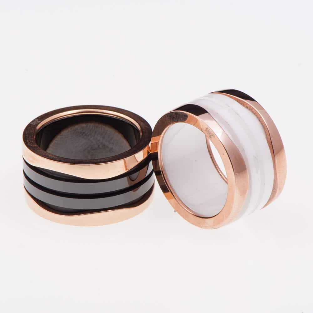 Пръстен от "Jacklin hugasian" в розова стомана,бяла и черна керамика .