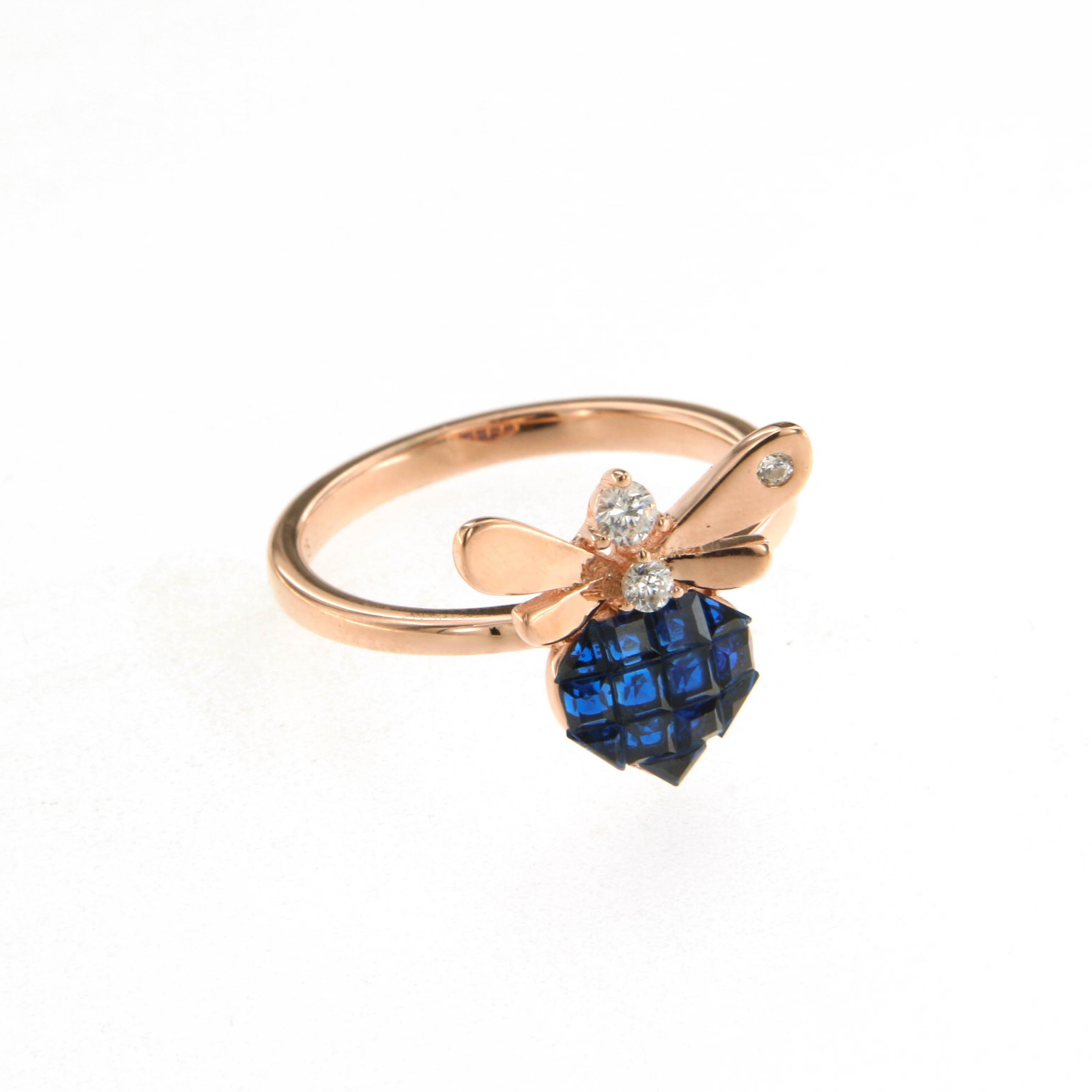Пръстен от “Jacklin hugasian” в розово сребро с цирконии и тъмно син сапфир.