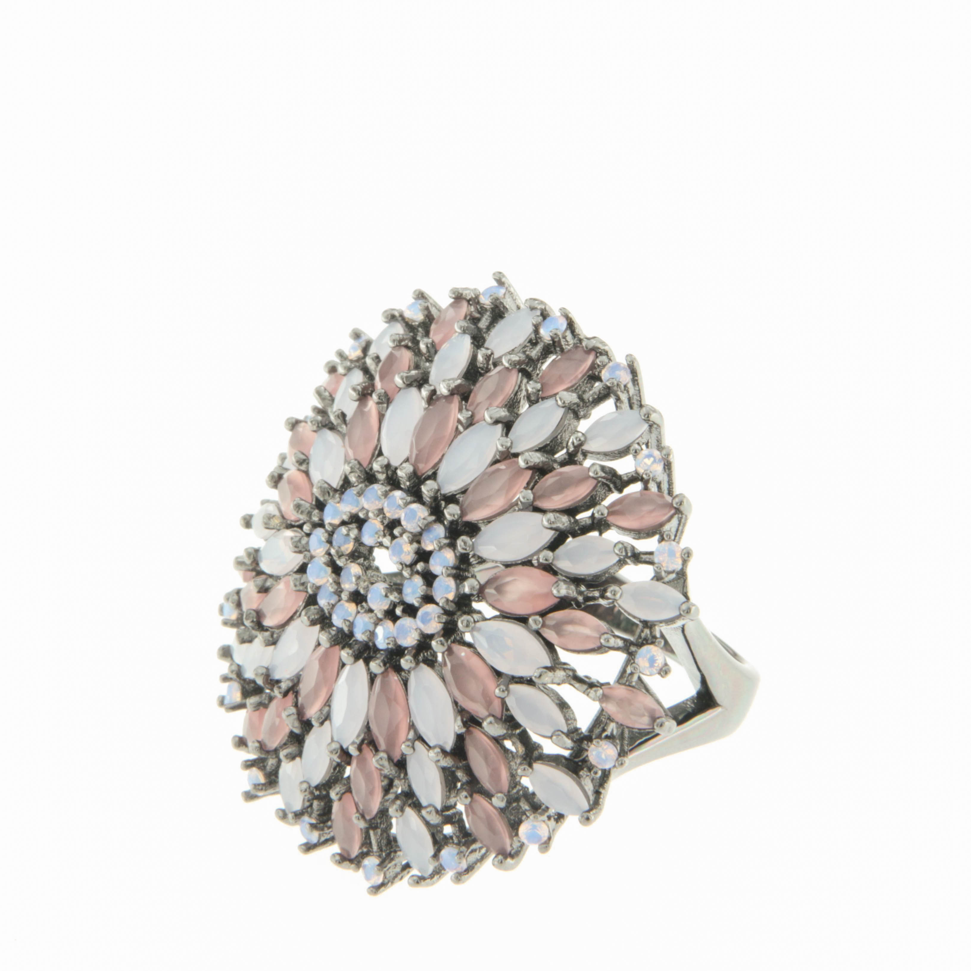 Пръстен от "Jacklin hugasian" в сребро с черен родий, лунен камък, опал и розов кварц.