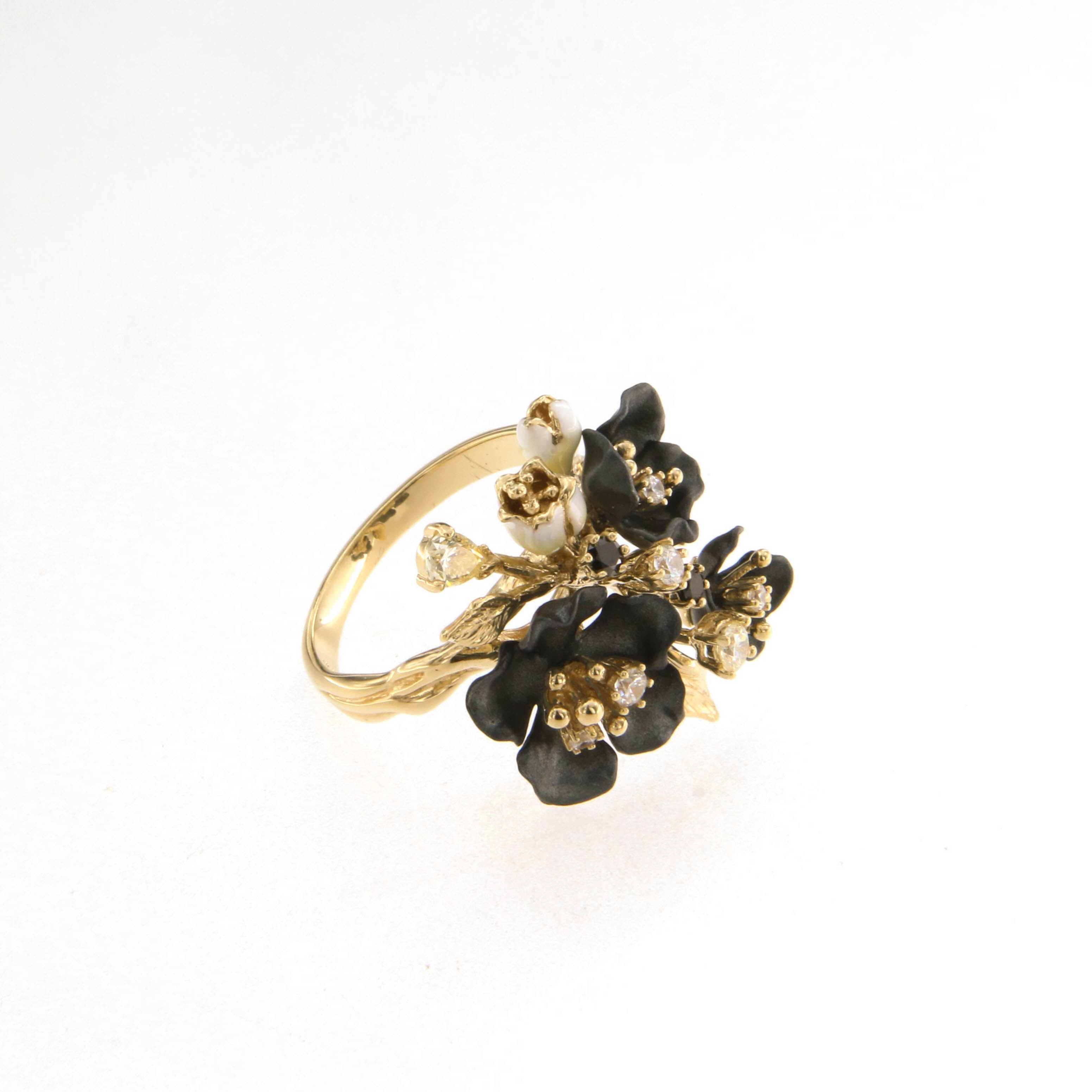 Пръстен от “Jacklin hugasian” в сребро с позлата с разноцветен емайл, оникс и циркони. Колекция “Roberto Bravo”. Произход Италия