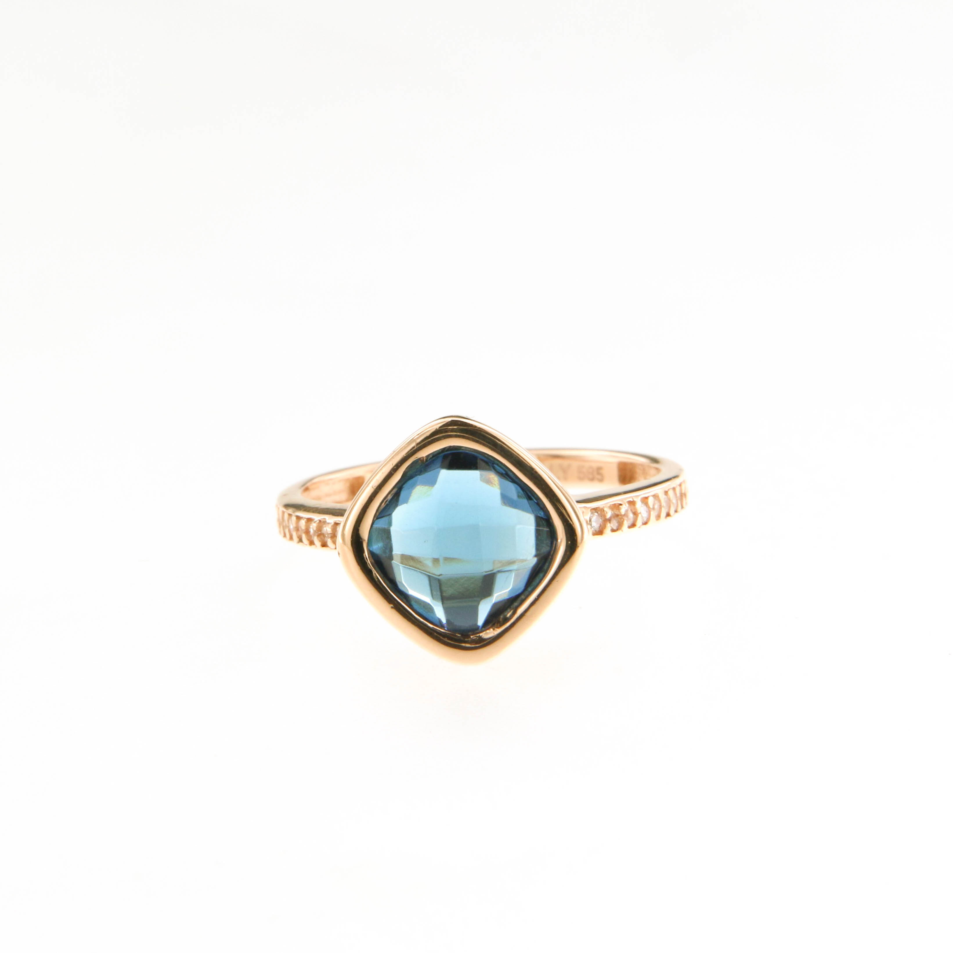 Пръстен от “Jacklin hugasian” в розово злато гланц с лондон топаз и цирконий.