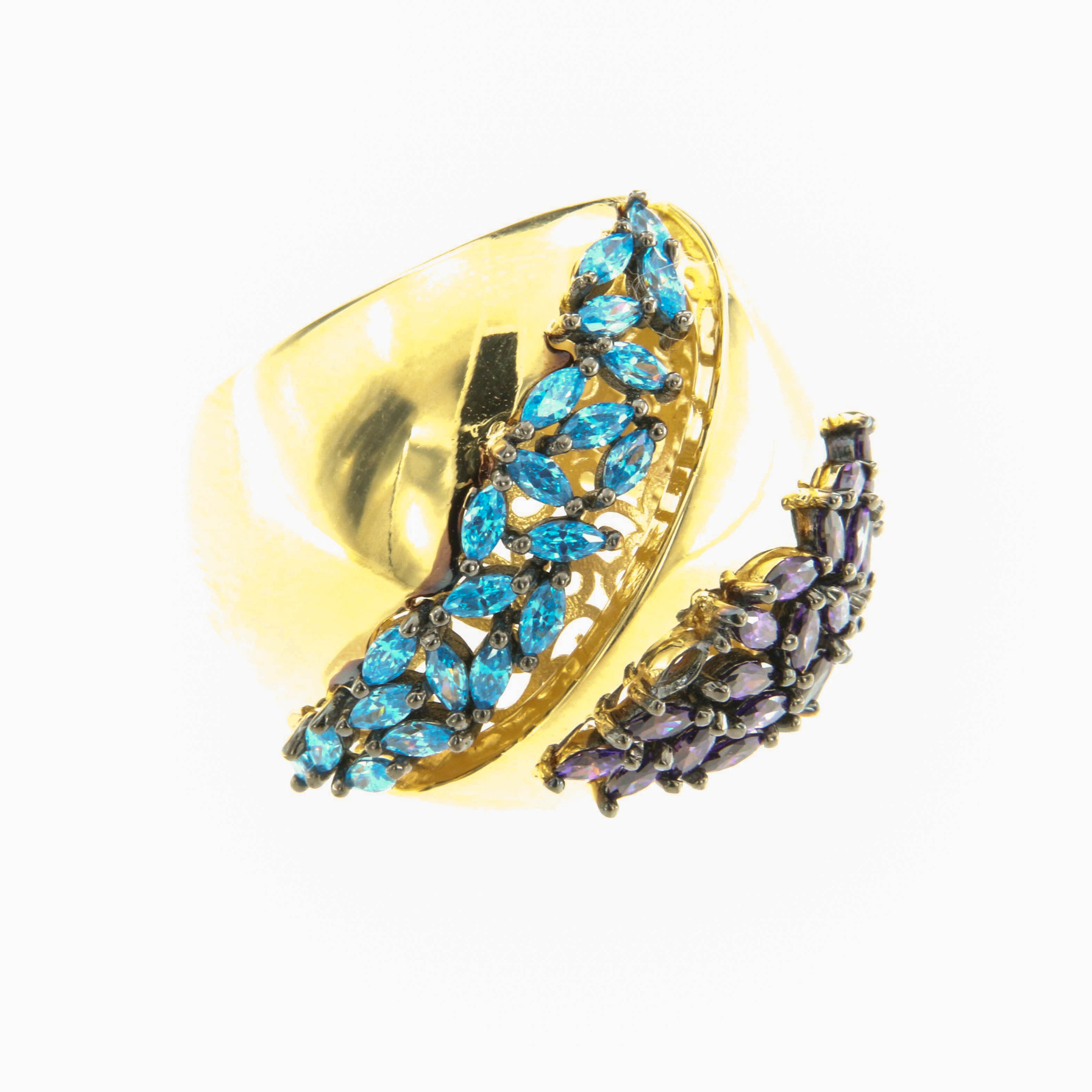 Пръстен от “Jacklin hugasian” в жълто злато гланц с лилав аметист и син топаз.
