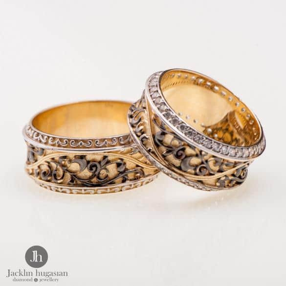 Венчални халки модел от "Jacklin hugasian" в бяло и жълто злато с черен емайл. Дамският модел е с цирконии.