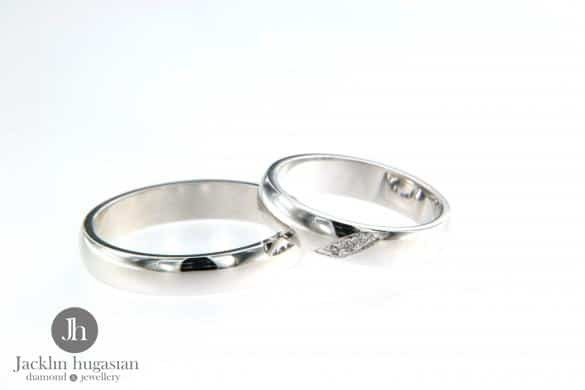 Венчални халки от "Jacklin hugasian " бяло злато гланц с диаманти. 14 К 585 Широчина: 4 мм. Размери: N51 и N60 Грам: 8.20 гр. Характеристики Dia: VS-G/ 0.03ct.