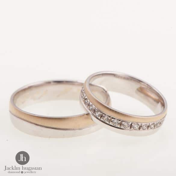 Венчални халки от " Jacklin hugasian " бяло злато гланц и жълто злато мат с цирконий. Широчина 5.00 мм. Ръчна изработка.