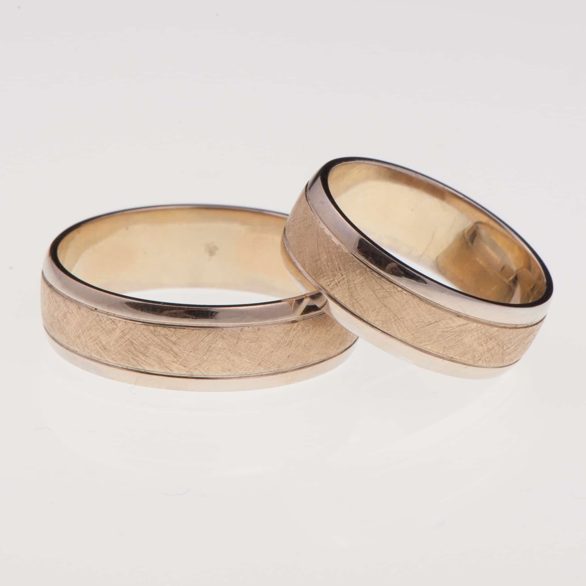 Венчални халки от " Jacklin hugasian " бяло злато гланц и жълто злато сатeниран мат.Широчина 6.00 мм.Ръчна изработка. Моделът може да бъде изработен и в други цветови съчетания. 14 К 585 Размер : N53 и N64 Грам : 9.58 гр.