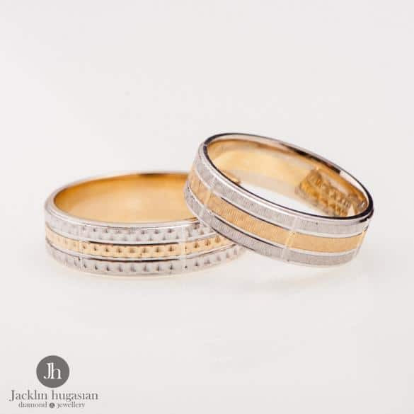 Венчални халки от " Jacklin hugasian " в бяло и жълто злато с цирконий,лазерна шлифовка.Фабрична изработка.