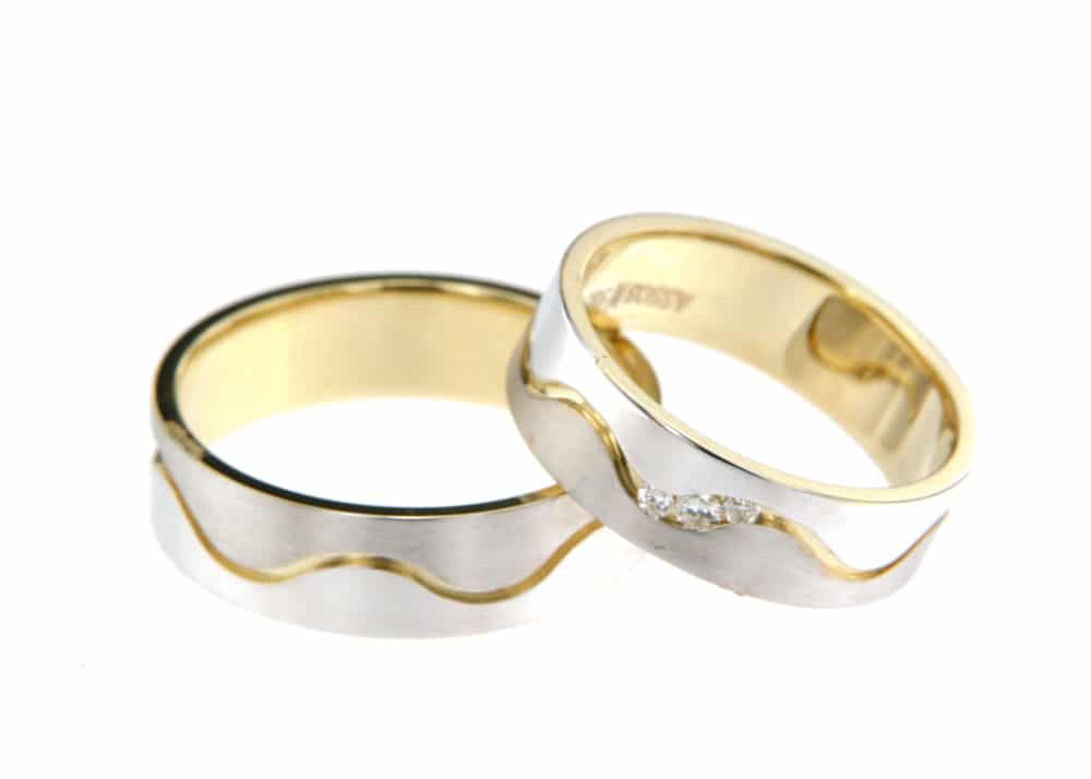 Венчални халки от " Jacklin hugasian " в бяло и жълто злато, мат и гланц с диаманти.Фабрична изработка.